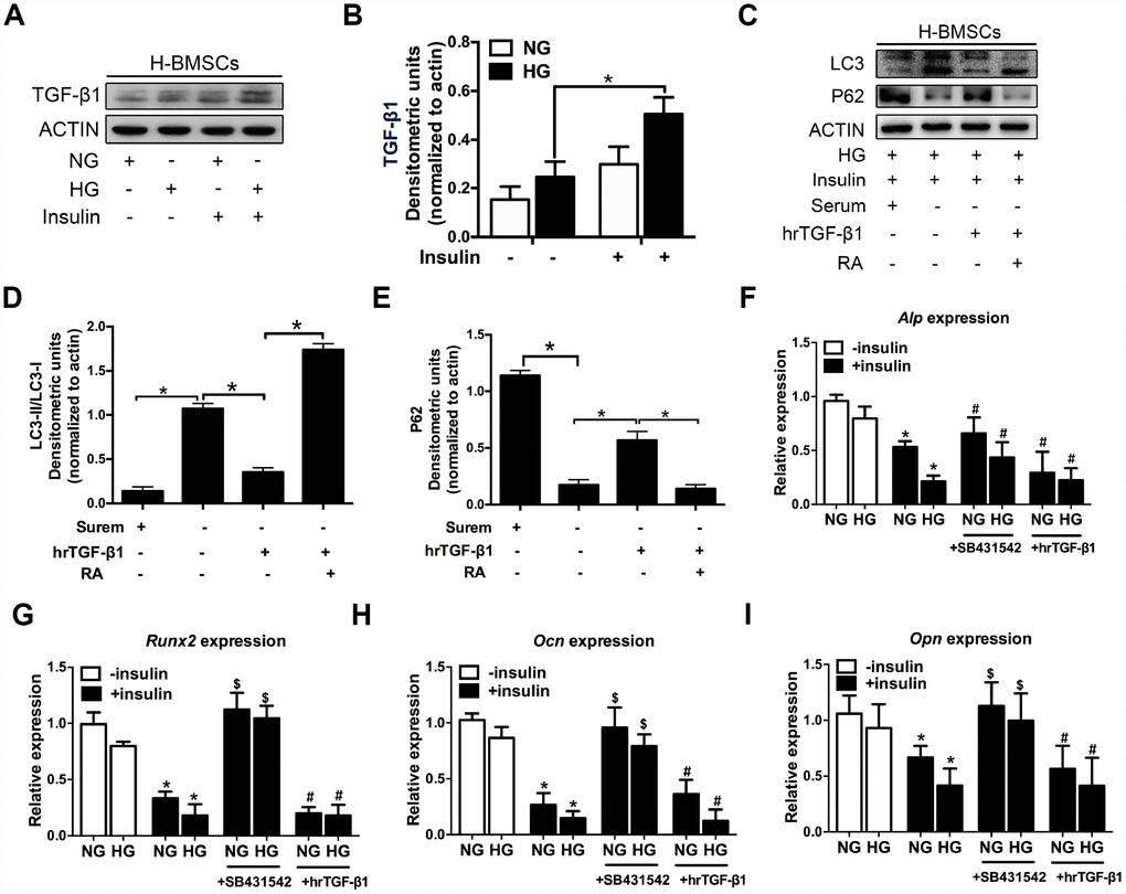 Previous research indicated that hyperinsulinemia reduces osteoblast activity via upregulation of TGF-β [20], and these results prompted us to investigate the potential role of TGF-β1 in insulin-mediated osteogenic differentiation of H-BMSCs. As expected, TGF-β1 expression increased in H-BMSCs under hyperglycemic and hyperinsulinemia conditions (Figure 3A, 3B). To investigate the role of TGF-β1 in insulin inhibiting autophagy, human recombinant active TGF-β1 (hrTGF- β1) was added, and the results showed that the expression of LC3-II and LC3-II/LC3-I ratio significantly decreased, while the expression of P62 increased. In addition, RA reversed these effects of hrTGF-β1 (Figure 3C–3E). These data suggested that TGF-β1 accelerated autophagy suppression of H-BMSC under high-glucose and insulin conditions.