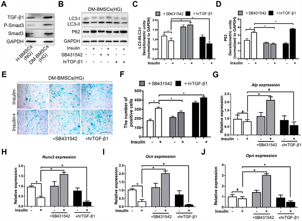 Insulin impedes osteoblast differentiation, inhibits autophagy and promotes premature senescence of H-BMSCs in a TGF-β1 dependent manner. To further explore whether these effects of insulin also present in the DM-BMSCs, we first examined the expression of the TGF-β1 signaling pathway in DM-BMSCs, and found the expression of TGF-β1 and P-smad3 increased in DM-BMSCs (Figure 4A). Then, we investigated autophagy, senescence, and osteogenic differentiation of DM-BMSCs by inhibiting or activating the TGF-β1 signal pathway. The results showed that the LC3-II/LC3-I ratio was decreased and the P62 was increased in insulin-treated DM-BMSCs compared with untreated cells. However, when blocking the TGF-β1 signal with SB431542, the LC3-II/LC3-I ratio increased and P62 decreased. Conversely, the LC3-II/LC3-I ratio decreased and P62 increased when activating the TGF-β1 signal with hrTGF-β1 (Figure 4B–4D). These results suggested that insulin inhibited autophagy, promoted senescence of DM-BMSCs and these effects could be abrogated by inhibiting TGF-β1 signaling.