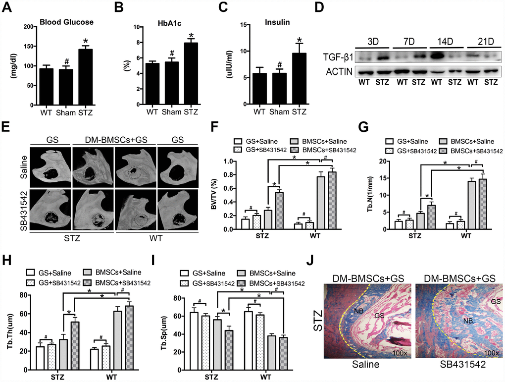 To mimic the whole features of early stage of type 2 diabetes, HFD and STZ were used to induce peripheral insulin resistance. The STZ group showed significantly higher plasma glucose, HBA1c and insulin levels compared to sham and WT group (Figure 5A–5C). Full thickness bone defects (1×3mm) were made in the inferior border of the mandible, and the calluses were harvested at postoperative 3, 7, 14, and 21 days. The results showed the expression of TGF-β1 increased in STZ group (Figure 5D). To investigate whether blocking the TGF-β1 signaling could promote bone regeneration, mandibular critical-sized bone defects were made in diabetic rat and wide type rat. DM-BMSCs with gelatin sponge (GS) or GS alone were implanted into defects. SB431542 or saline were injected into the local defect once every 2 days for 1 week. After 8 weeks, GS group did not show any new bone formation on the saline side, while a small amount of new bone was showed on the SB431542 side both in STZ and WT rat. DM-BMSC and GS group showed more plate-like bone structures on the SB431542 side than the saline side in STZ rat, and no significant difference was displayed on the two sides of WT rat (Figure 5E). The quantitative analysis indicated that the ratio of new bone volume to total volume (BV/TV), the number of trabecular bone (Tb.N.) and trabecular thickness (Tb.Th.) were higher on the SB431542 side than the saline side (Figure 5F–5H). However, there was less trabecular separation (Tb.Sp.) on the SB431542 side than the saline side (Figure 5I). Histological results also showed more new bone on the SB431542 side, displaying a large quantity of organized and mineralized bone tissue with lamellar bone morphology (Figure 5J). These results indicated that suppression of TGF-β1 signaling could promote bone regeneration in diabetic rat.