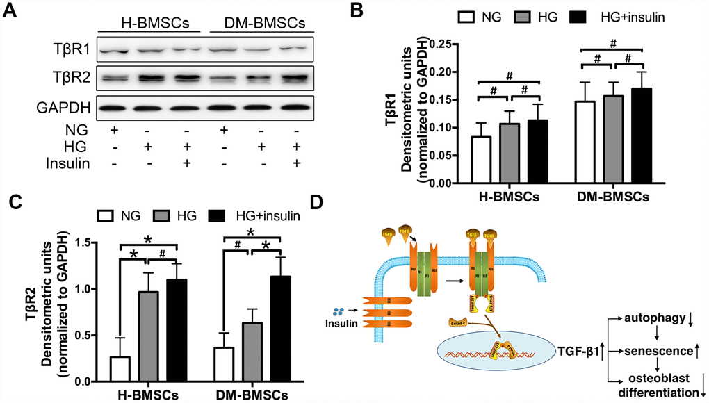 To explore the underlying mechanisms of TGF-β1signaling, we detected the expression of TGF-β1 receptor I and II (TβRI, TβRII) in H-BMSCs and DM-BMSCs. The results demonstrated that TβRII expression increased in H-BMSCs or DM-BMSCs under hyperglycemic and hyperinsulinemia conditions (Figure 6A, 6C), but TβRI expression did not change in these conditions (Figure 6A, 6B). These results suggested that insulin increased the expression of TGF-β1 receptor II, which was most likely responsible for the activation of the TGF-β1 signaling pathway. Thus, we conclude that insulin induces a modest increase of TβRII expression and then activates the TGF-β1 signaling pathway driving the downstream insulin-responsive genes activation, which impede osteogenesis of BMSCs by inhibiting autophagy and promoting premature senescence (Figure 6D).