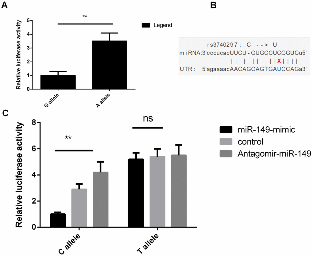 Then, we conducted the dual-luciferase reporter assay to validate the bioinformatics analysis findings. As shown in Figure 3, the PASMC cell lines transfected with vectors containing the A allele of rs7923671 showed higher relative luciferase activity compared to that containing the G allele (P<0.001, Figure 3A), which confirmed its allele-specific regulatory effect. For rs3740297, PASMC cell lines transfected with rs3740297 -C allele construct, miR-149 mimic, and antagomir miR-149 showed more sensitive change of the relative luciferase activity (Figure 3C, P < 0.001), which revealed its allelic binding effect to miR-149.