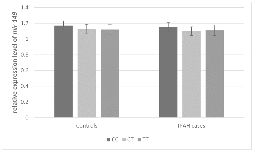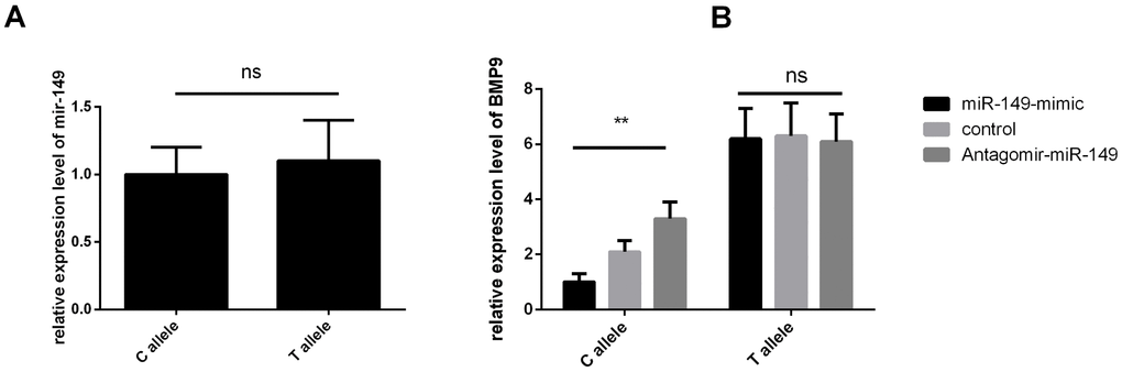 HaploRegv4.1 and miRNASNP V2 were used to annotate the functional elements for BMP9 rs3740297 and rs7923671. We found that rs7923671 was located at a locus with multiple transcription factor (Myc, Pax-2, Pou5f1, P300) binding site, and rs3740297 was located at the 3’ UTR region of the BMP9 gene and its C>T transition could cause a binding site loss of miR-149 (Figure 3B), which suggest their potential allele-specific regulatory effect. To verify our hypothesis, we first measured the expression level of miR-149 in plasma of and PASMC cells, respectively. As shown in Figure 4, the expression level of miR-149 was not influenced by the genotypes of SNP rs3740297, as well as the disease status of IPAH (P >0.05). Meanwhile, the PASMC cells transfected with vectors containing the C allele of rs3740297 showed identical expression level of miR-149, compared to those containing the T allele (Figure 5A, P >0.05).