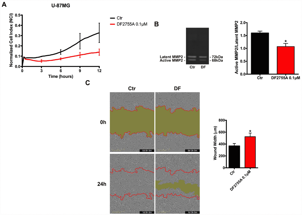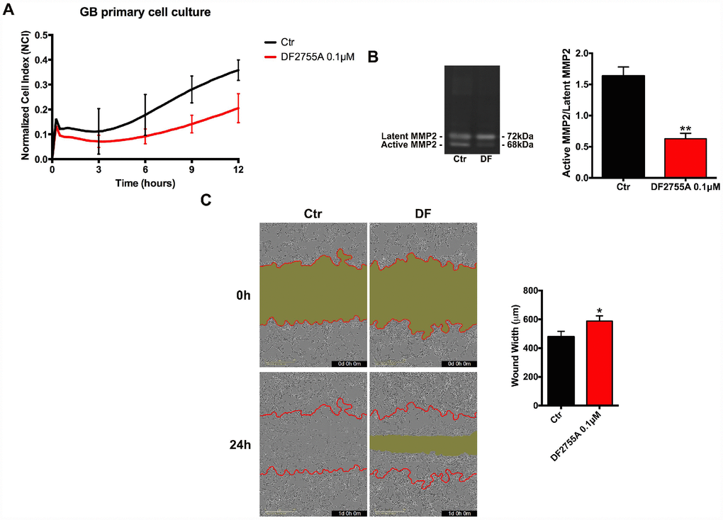 GB primary cell culture and U-87MG cells (cell seeding density 1 x 104 cells/well) were plated into 96-Well ImageLock™ plate (Essen Bioscience), and after 48 hours (GB primary cell culture) and 24 hours (U-87MG) of incubation the cell monolayers reached the confluence. Then cell monolayers were scratched with a wound marker™ tool, which allows obtaining high assay and imaging reproducibility in the scratched area. Non adherent cells were removed with two PBS washes and the adherent cells were incubated with fresh medium containing 10% FBS and the DF2755A treatment. Each treatment was performed in thirty-two replicates for GB primary cell culture and thirty-one replicates for U-87MG cells. The Incucyte™ Scratch Wound Software was used to acquire and analyse images from wound closure for 24 hours (2 images per well and per hour). This software utilizes three separate metrics to quantify cell migration over time. In this regard wound shrinkage is automatically monitored by Wound Width (μm). Changes in Wound Width are linked to cell migration.