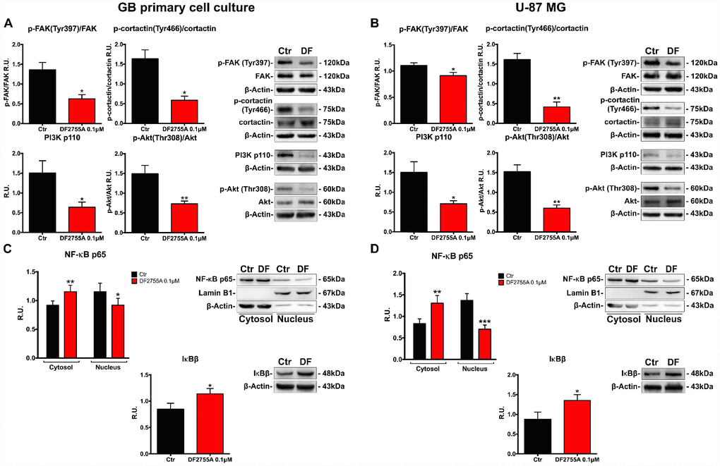 Proteins involved in cytoskeletal dynamics and migration, such as the active form of focal adhesion kinase (p-FAK) and p-cortactin, were studied by western blotting in GB primary cell culture (Figure 4A) and U-87MG cell line (Figure 4B). In both cell types, DF2755A was able to decrease p-FAK, p-cortactin, PI3K/p-Akt protein levels in coherence with the effect observed in chemotaxis and migration assays. PI3K/Akt signalling activation induces several signal transduction events leading to cellular migration, cell invasion and focal adhesion formation. After CXCL8 binding, CXCR1 and CXCR2 receptors can activate the signal cascade events linked to PI3K/Akt signalling pathway and FAK phosphorylation [38, 39, 43]. DF2755A significantly decreased PI3K protein levels and p-Akt/Akt ratio in both GB in vitro models. In this regard, since NF-κB p65 is a downstream target of PI3K/Akt and is one of the effectors in the CXCL8 signalling pathway involved in cell invasion [26, 29, 30, 44]; it was investigated in GB primary cell culture (Figure 4C) and U-87MG cells (Figure 4D). The western blotting analysis was performed on cytosolic and nuclear protein extracts obtained by subcellular fractionation. In agreement with previous results related to PI3K/p-Akt protein levels, cytosolic NF-κB p65 protein levels were higher in treated cells compared to untreated cells in both GB cellular models used. The antagonist effect probably enhanced the NF-κB p65 cytosolic accumulation and its inactivation through interaction with its cytoplasmic inhibitor IκBβ, thus resulting in reduced NF-κB p65 nuclear translocation. DF2755A treatment significantly down regulated nuclear NF-κB p65 protein levels (the effect is more pronounced in U-87MG cells than GB primary cell culture), while increasing the protein levels of its cytoplasmic inhibitor IκBβ.