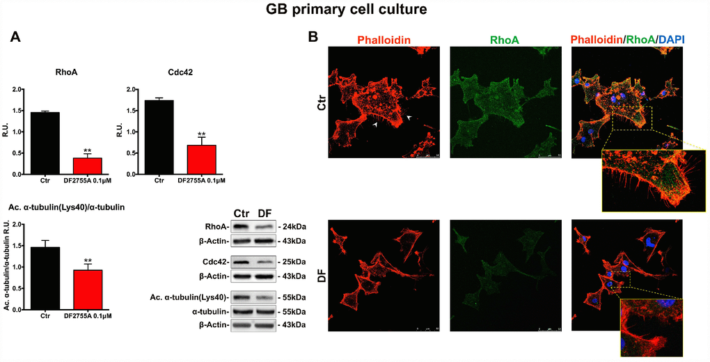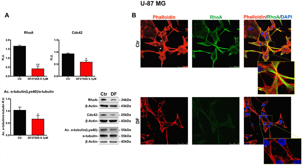 In Figures 5A and 6A, the western blotting analysis for the members of the Rho family, such as RhoA and Cdc42, in GB primary cell culture and U-87MG cells are reported, respectively. RhoA and Cdc42 protein levels were significantly decreased by DF2755A treatment. In the same Figures, the levels of acetylated α-tubulin were evaluated by western blotting analysis, being the acetylation at lysine 40 a key factor in cytoskeleton stabilization, cellular adhesion and motility. DF2755A treatment induced a significant decrease in lysine acetylation levels in both cellular models leading to a significant reduction of the acetylated α-tubulin/α-tubulin ratio, as reported in Figure 5A and 6A. To confirm CXCL8-dependent modulation of cytoskeletal dynamics, the effect of DF2755A on microfilaments localization was assessed by immunofluorescence analysis for actin (by phalloidin-staining) and RhoA using confocal laser microscopy (Figures 5B and 6B). GB primary cell culture and U-87MG cells showed characteristic filopodia, also called microspikes (indicated by white arrowheads), while allosteric inhibition of CXCL8 receptors induces a pronounced retraction of these cytoskeletal structures in both cellular models. In this regard, a strong reduction in RhoA fluorescence intensity was observed upon DF2755A treatment compared to the control cells, in agreement with the western blotting findings.