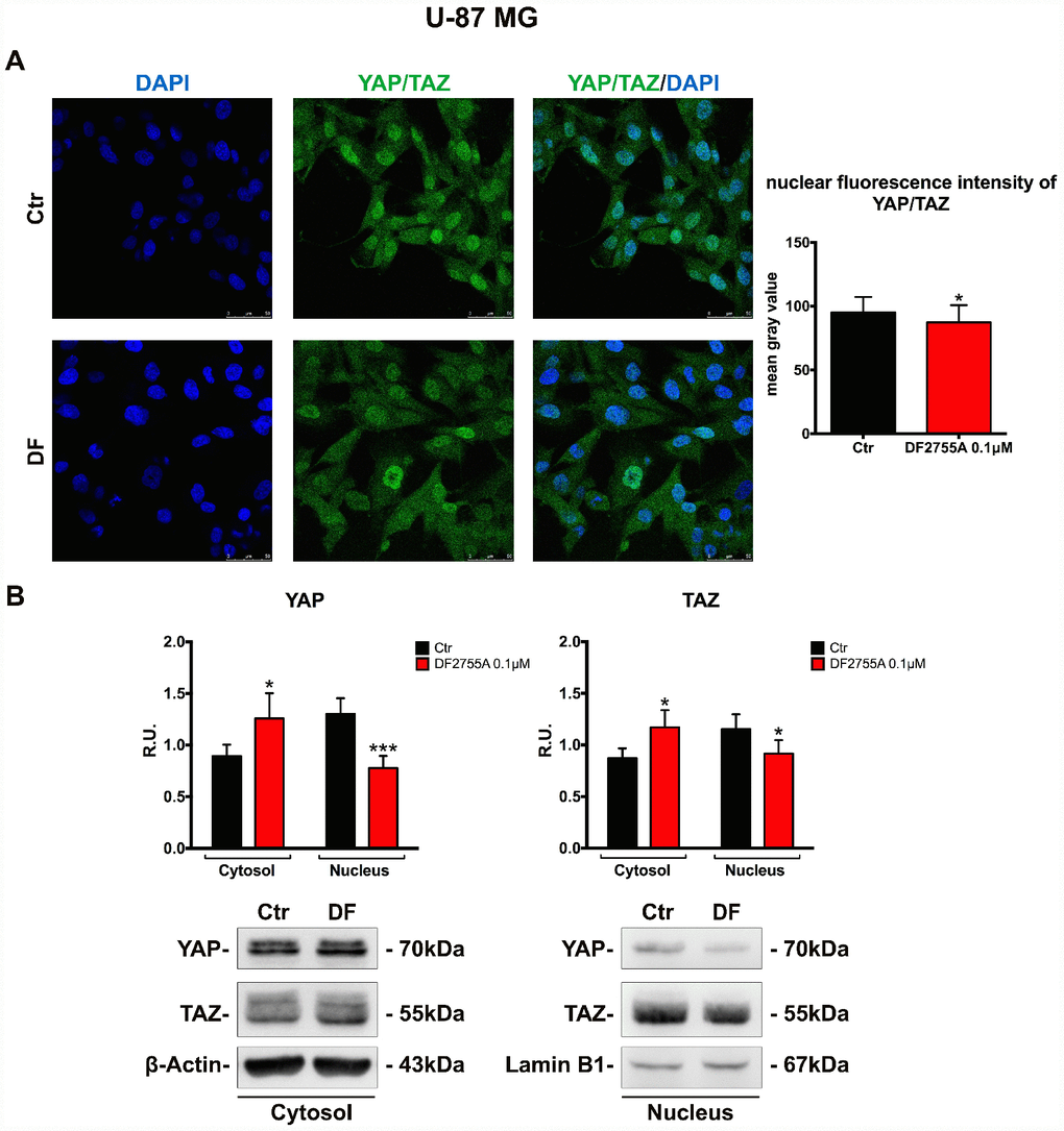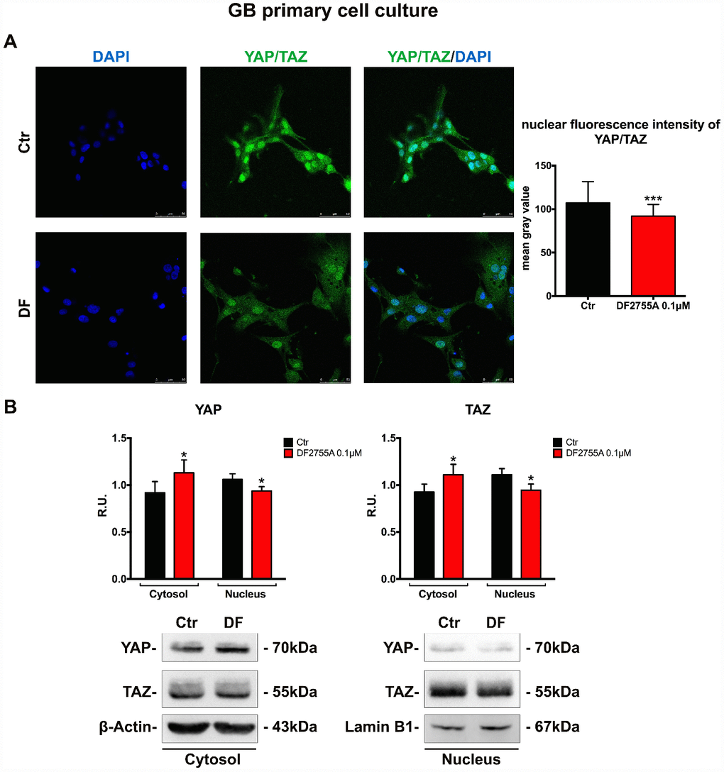 U-87MG cell line and GB primary cell culture were allowed to adhere on poly-L-lysine coated glass coverslips (15 μg/ml) for 24 hours and then exposed to DF2755A for additional 24 hours. After the treatment, the cells were washed with PBS and immediately fixed with 4% paraformaldehyde in PBS, for 10 minutes at RT. The cells were washed thrice with PBS and then permeabilized with 0.1% Triton-X100 in PBS for 5 minutes at RT. The unspecific sites were blocked by incubation with 4% BSA in PBS for 20 minutes at RT. The cells were incubated overnight at 4°C with following primary antibodies: anti-RhoA 1:200, anti-YAP/TAZ 1:50 and with Phalloidin-TRITC (50 μg/ml; Sigma-Aldrich) all diluted in 4% BSA in PBS. Primary antibodies were revealed by secondary Alexa Fluor 488 (for anti-RhoA) or Alexa Fluor 633 (for anti-YAP/TAZ) conjugated anti-mouse and anti-rabbit IgG antibodies (incubation of 1 hour at RT), except for Phalloidin staining. After five washes with PBS, coverslips were mounted with Vectashield mounting medium with DAPI (Vector Laboratories Burlingame, CA, USA) and then observed at confocal laser microscope (Leica TCS SP5).