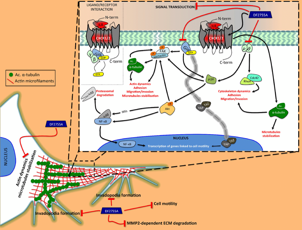 The observed reduction of α-tubulin and p-cortactin activation following DF2755A exposure is in line with our previous studies on the role of CXCR1 and CXCR2 on sensory neurons and confirm a link between CXCL8 signalling and cytoskeletal rearrangement in different cellular contexts [72].