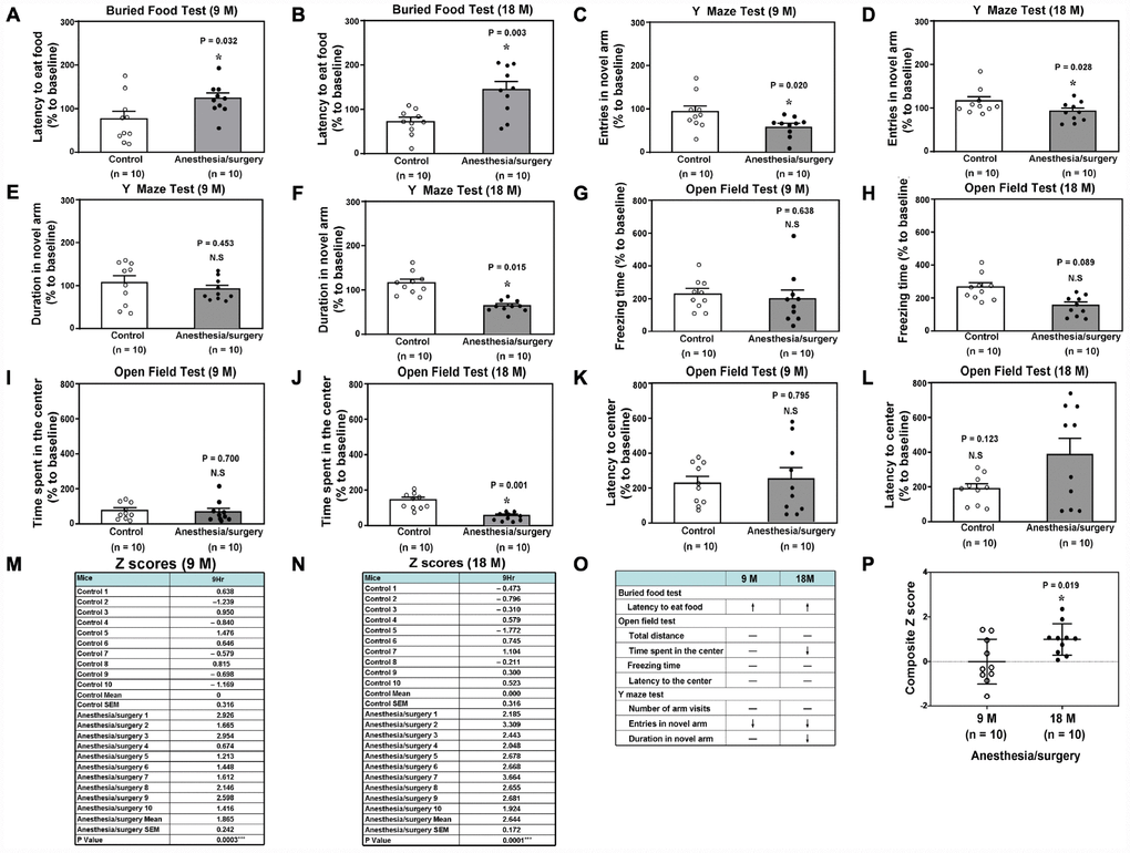 The anesthesia/surgery differently induced behavioral changes in buried food test, Y maze test and open field test as compared to the control condition (Figure 2A–2L) between the 9 and 18 months old mice, the composite Z scores of which, obtained from the 9 and 18 months old mice, were summarized and compared (Figure 2M, 2N). Specifically, the anesthesia/surgery caused greater behavioral changes in the 18 months old mice than those in the 9 months old mice (Figure 2O), and the Student’s t-test further demonstrated that the composite Z scores in the 18 months old mice were higher than those in the 9 months old mice (Figure 2P, P = 0.019, n = 10). Note that the mice in the control group did better in some of the behavioral tests at the 9 hours after the control condition than those at the baseline, potentially due to the learning effects of these tests.