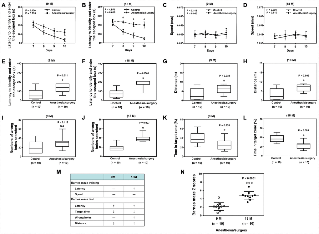 Next, we found that the anesthesia/surgery caused significant changes in the latency to identify and enter the escape box, but not speed, as compared to the control condition in the Barnes Maze training in 18, but not 9, months old mice (Figure 3A to 3D). In the Barnes Maze testing, the anesthesia/surgery caused significant changes in the number of wrong holes searched before identifying the escaped box in 18, but not 9 month old mice. The anesthesia/surgery caused significant changes in the latency to identify and enter the escaped box, distance, and the time in target zone in both 9 and 18 months old mice (Figure 3E to 3L). However, the anesthesia/surgery caused greater behavioral changes in the Barnes maze training and testing in18 months old mice than in 9 months old mice (Figure 3M). Specifically, the anesthesia/surgery caused higher composite Z scores, representing the behavioral changes in the Barnes Maze test, in the 18 months old mice than those in the 9 months old mice (Figure 3N, P < 0.0001, n = 10, Student’s t-test). These data demonstrated that the anesthesia/surgery was able to induce age-dependent behavioral changes, e.g., postoperative delirium-like behavior and cognitive impairment, in the mice, with greater changes in the older mice.