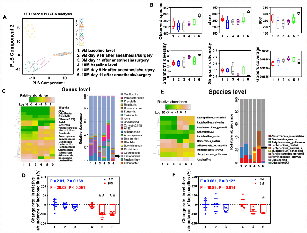 Given the findings that the anesthesia/surgery induced age-dependent changes in the behaviors in mice, next, we asked whether the anesthesia/surgery could cause age-dependent changes in gut microbiota in the mice. We found that the anesthesia/surgery induced significant alterations in the component of the gut microbiota in 18, but not 9, months old mice (Figure 4A), and different microbiota diversity between the 9 and 18 months old mice (Figure 4B). The heatmap and taxonomic composition distribution demonstrated that the anesthesia/surgery induced different change rate of reduction in the relative abundance of Lactobacillus (genus level, Figure 4C) and Lactobacillus (species level, Figure 4E). Finally, the quantification showed that the anesthesia/surgery induced a significant change rate of reduction in the relative abundance of Lactobacillus as compared to the control condition in the 18 (F = 29.08, P < 0.001 one- way ANOVA, Figure 4D, genus level; F = 10.89, P = 0.014, one-way ANOVA, Figure 4F, species levels), but not 9, months old mice at 9 hours and 11 days post-anesthesia/surgery. Specifically, the anesthesia/surgery induced greater change rate of reduction in relative abundance of Lactobacillus in the 18 months old mice than that in the 9 months old mice. These data demonstrated that the anesthesia/surgery was able to cause age-dependent changes in the gut microbiota.