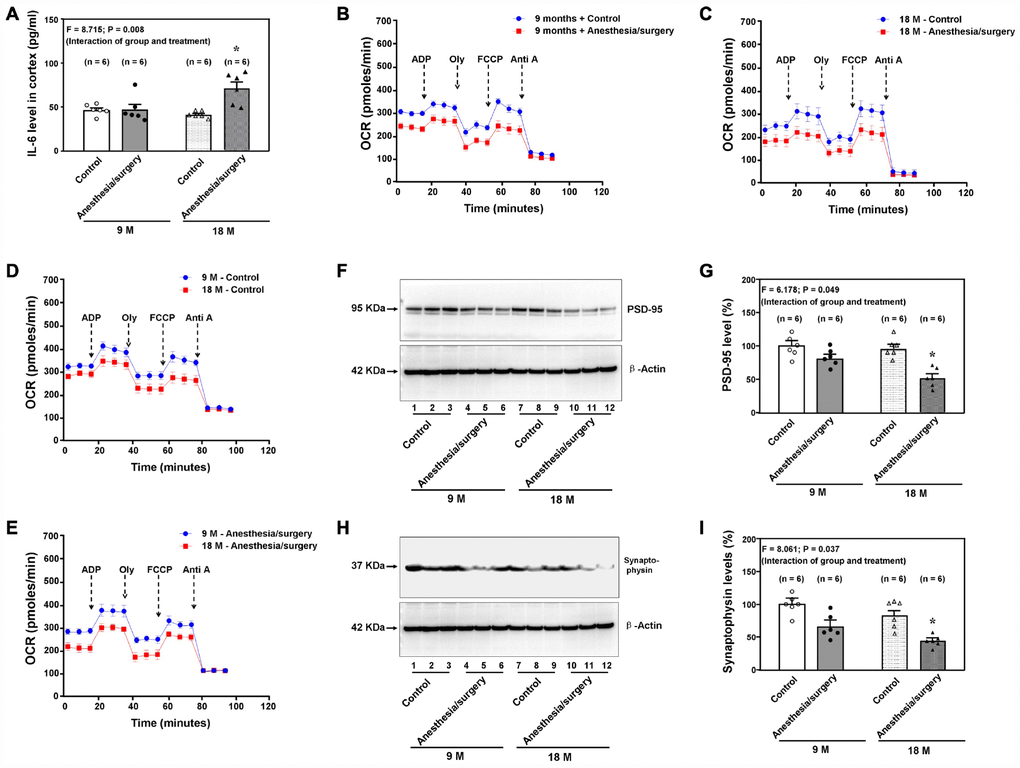 Consistently, we found that the anesthesia/surgery induced age-dependent increases in brain IL-6 levels in the 9 and 18 months old mice (Figure 5A, F = 8.715, P = 0.008, two-way ANOVA, n = 6). The anesthesia/surgery decreased the brain mitochondrial function as compared to the control condition in either 9 (Figure 5B) or 18 (Figure 5C) months old mice. Moreover, the 18 months old mice had a lower baseline mitochondrial function (Figure 5D) and greater anesthesia/surgery-induced mitochondrial dysfunction (Figure 5E) than the 9 months old mice did, including base respiration rate, ADP respiration rate and maximal respiration rate (data not shown) at 9 hours after the anesthesia/surgery. In addition, the anesthesia/surgery reduced the levels of PSD-95 (Figure 5F and 5G, F = 6.178, P = 0.049, two-way ANOVA, n = 6) and synaptophysin (Figure 5H and 5I, F = 8.061, P = 0.037, two-way ANOVA, n = 6) in the hippocampus of 18 months old mice at 11 days after the anesthesia/surgery. These data demonstrated that the anesthesia/surgery caused an age-dependent increase in pro-inflammatory cytokine IL-6, mitochondrial dysfunction, and synaptic loss in the brain tissues of the mice