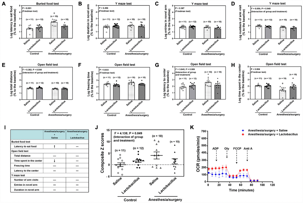 Treatment with Lactobacillus rescued the anesthesia/surgery-induced behavioral and cellular changes in mice