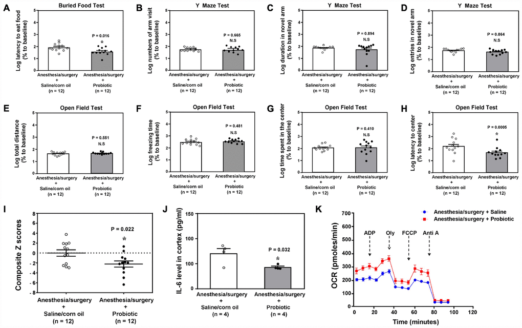 In conclusion, we have demonstrated that anesthesia/surgery induces age-dependent changes in the gut microbiota (reduction in lactobacillus), increases brain levels of IL-6, decreases levels of synaptic marker, and reduces mitochondrial function while also promoting development of postoperative delirium-like behaviors in the mice. Treatment with Lactobacillus or probiotic prior to anesthesia/surgery mitigated these detrimental effects, strongly suggesting that abnormalities in the gut microbiota contribute to the development of postoperative delirium. As such, clinical investigations of this possibility seem warranted.