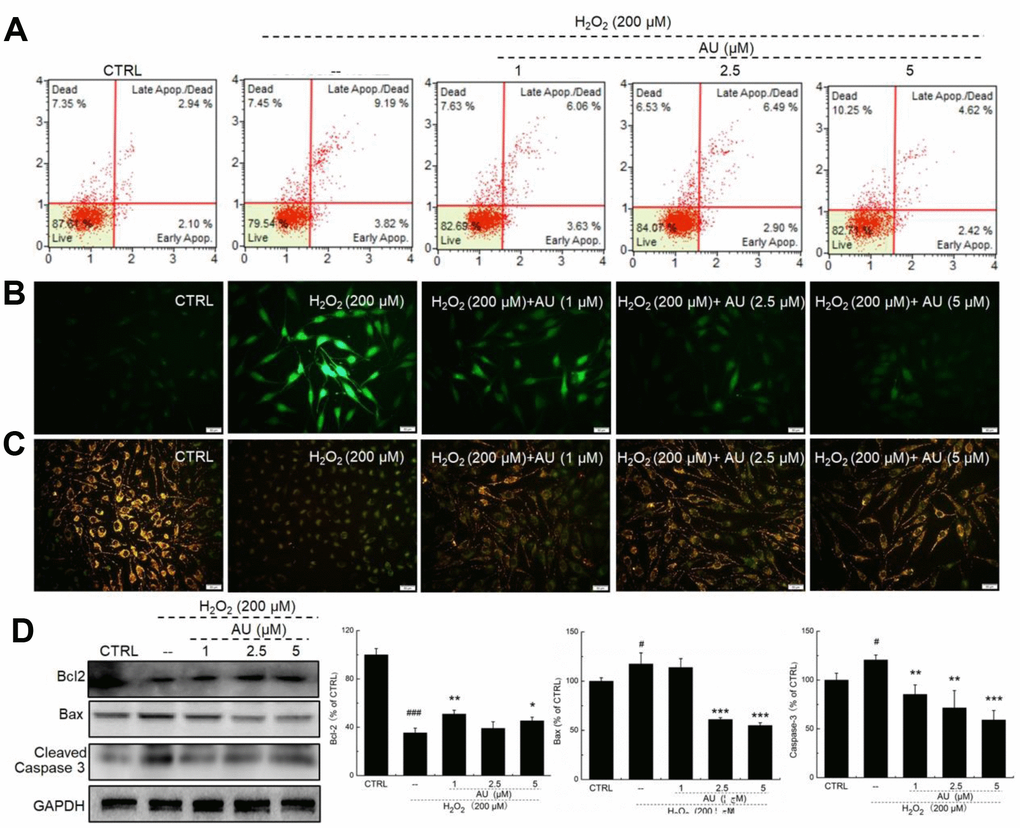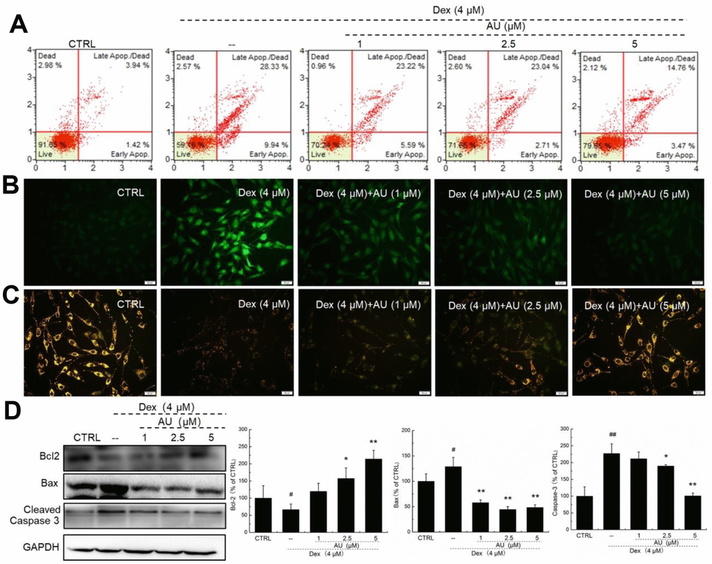 AU reduced the apoptotic rate of MG63 cells exposed to 4 μM of Dex for 24 h in a dose-dependent manner (Figure 1A). Mitochondrial function is one of the factors contributing to apoptosis and it plays a role in the feedback loop that responds to ROS accumulation [17]. The over-accumulation of intracellular ROS (Figure 2B) and the enhanced dissipation of MMP (Figure 2C) in MG63 cells caused by Dex were all strongly relieved by AU at doses of 1, 2.5 and 5 μM, as shown by the reduced green fluorescence intensity, and enhanced ratio of red/green fluorescence intensity, respectively. Bcl-2 family members contribute to cell apoptosis related to mitochondrial function [15]. Compared to MG63 cells exposed to Dex alone, AU significantly enhanced the expression levels of Bcl-2 and reduced the expression levels of Bax and cleaved caspase-3 (P <0.05) (Figure 1D).
