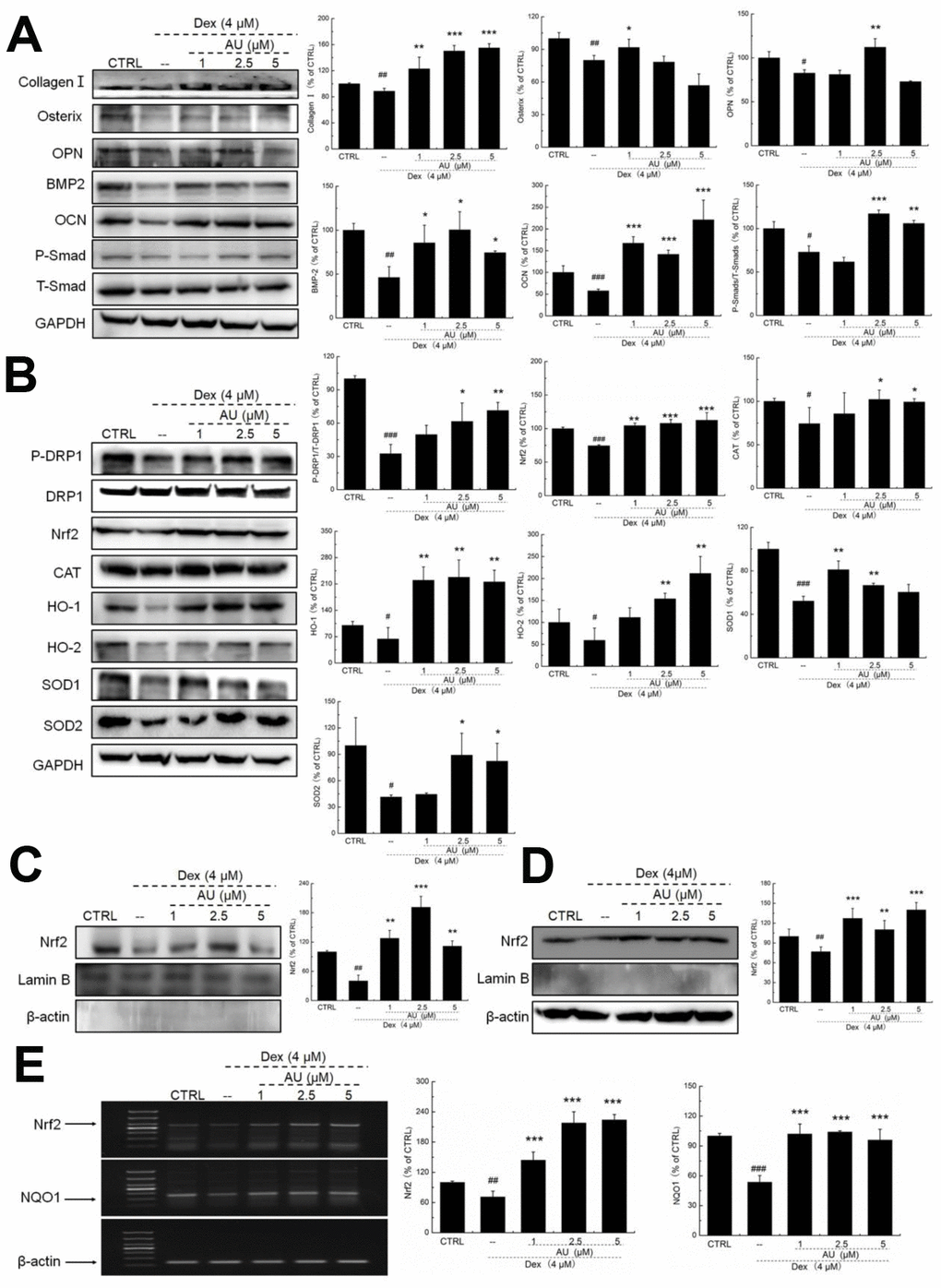 According to our study and previous findings, proteins including collagen I, osterix, OPN, BMP-2, OCN, and Smads are biomarkers of osteoblast differentiation [16]. 24-h 4 μM DEX exposure strongly reduced the expression levels of all proteins related to osteoblast differentiation, including collagen I, osterix, OPN, BMP-2, OCN, and P-Smads (P <0.05) (Figure 2A), which were all up-regulated after AU incubation (P <0.05) (Figure 2A).
