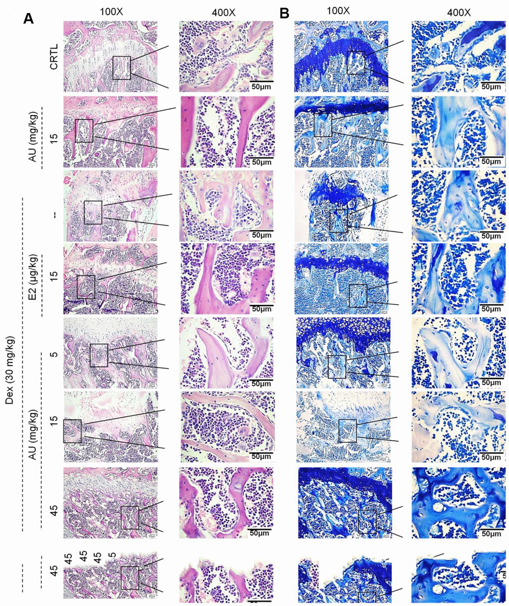 Compared with Dex-damaged mice with osteoporosis, 8-week AU administration made the cortical bone more continuous and reduced the number of osteoclasts, as detected by HȦE staining (Figure 5A). Giemsa staining revealed that AU treatment enhanced the number of trabecular osteoblasts in the mice (Figure 5B).