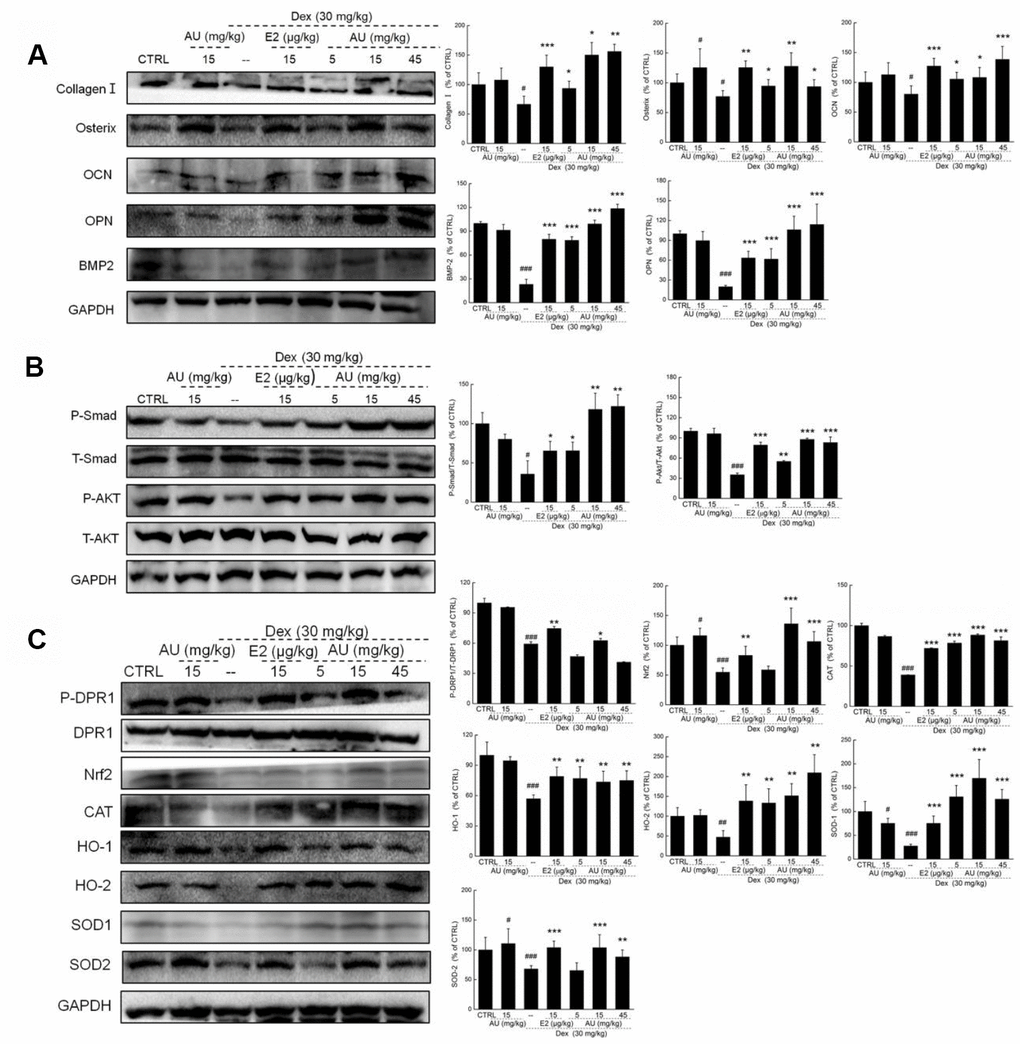 It is well known that oxidative stress inhibits bone cell differentiation and impairs bone integrity [18]. In Dex-induced osteoporotic mice, high levels of ROS and low levels of SOD and CAT were noted in peripheral blood (P <0.05) (Table 2). Compared with the osteoporotic mice, AU resulted in an 18.0% reduction in ROS, and 15.6% and 35.1% increases in SOD and CAT levels in peripheral blood (P <0.05) (Table 2). In the lysed tibias and fibulas of the Dex-induced osteoporotic mice, the expression levels of Nrf2 signaling proteins were all strongly reduced (P <0.05) (Figure 8). Comparatively, E2 and AU relieved these reductions (P <0.05) (Figure 8). AU, especially at doses of 15 mg/kg, caused 16.4%, 94.5%, 101.2%, 12.5%, 182.3%, 173.6%, and 30.2% increases in the expression levels of P-DPR1, Nrf2, CAT, HO-1, HO-2, SOD-1, and SOD-2 in bone tissues compared with those of the control mice (P <0.05) (Figure 7C).
