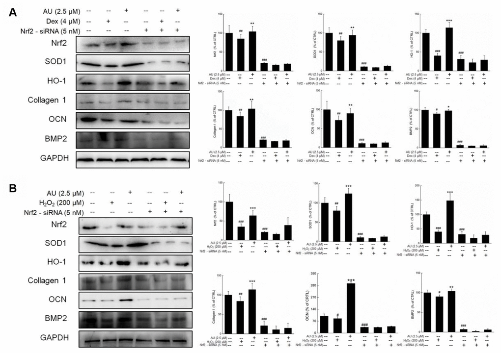 Further experiments were performed in Nrf2-siRNA transfected MG63 cells. The enhancing effects of AU on the expressions of Nrf2, SOD1, HO-1, Collagen 1, OCN, and BMP2 were all suppressed by Nrf2-siRNA transfection in both Dex and H2O2 damaged transfected MG63 cells (Figure 8A and 8B). In contrast, the negative siRNA transfection failed to influence the modulatory effects of AU on the expressions of Nrf2, SOD1, HO-1, Collagen 1, OCN, and BMP2 in both Dex and H2O2 damaged MG63 cells (Supplementary Figure 3A and 3B).