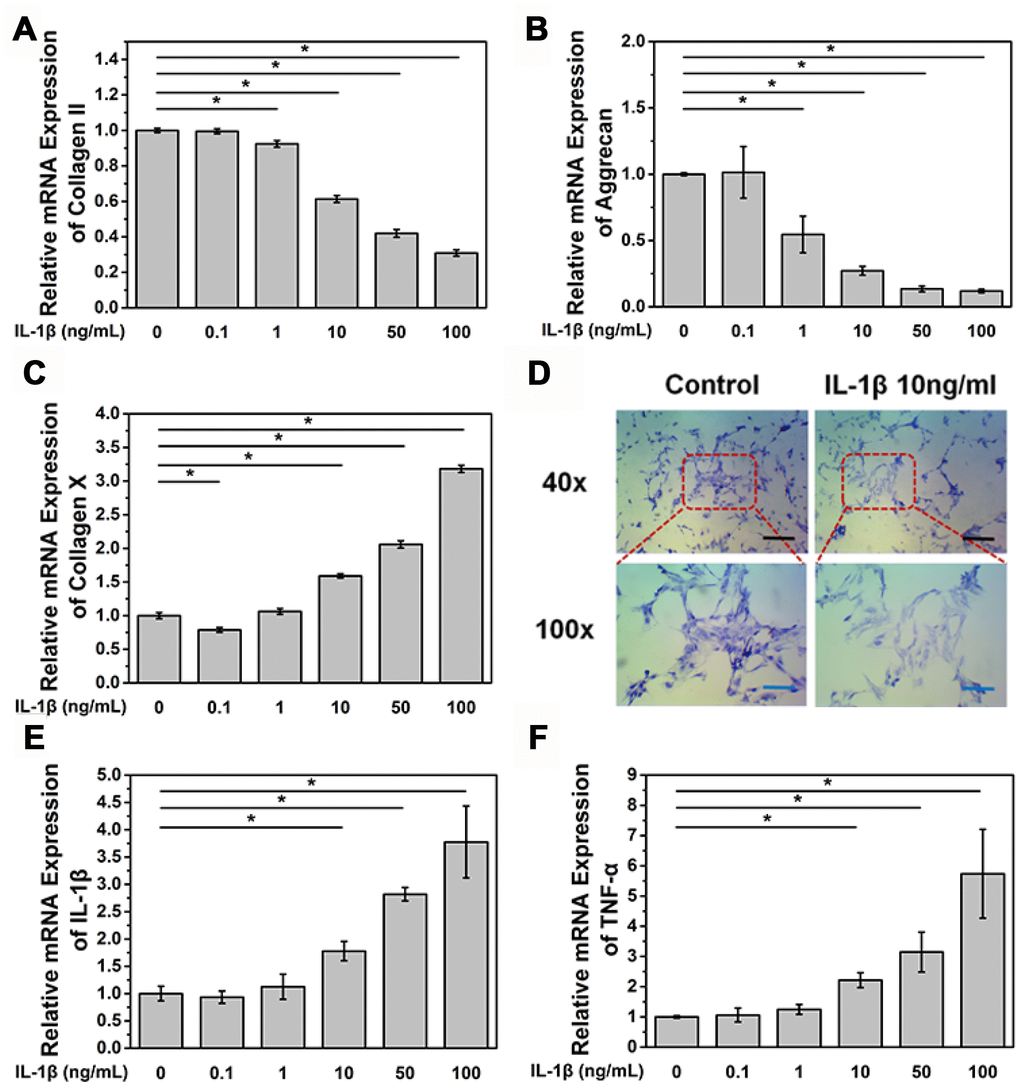 Primary NPCs were isolated from a male Sprague Dawley (SD) rat and cultured in a 6-well plate (5×105 cells per well). Cells were treated with different concentrations of IL-1β and were collected after 24 h. We found that IL-1β treatment reduced the mRNA expression level of COL2A1, aggrecan, and collagen X in a dose-dependent manner (Figure 1A–1C). The reduction in the mRNA expression of aggrecan and COL2A1 was found after treatment with IL-1β at a concentration of 1 ng/mL (p<0.05, Figure 1A and 1B), While significant reduction in the mRNA expression of collagen X was found after treatment with IL-1β at a concentration of 10 ng/mL (p<0.05, Figure 1C). Toluidine blue staining assay also showed that aggrecan expression decreased after 24 h treatment with IL-1β at a concentration of 10 ng/mL (Figure 1D). In contrast, the mRNA expression of the inflammatory factors IL-1β and TNF-α was higher than the control group after treatment with IL-1β at a concentration of 10 ng/mL (p<0.05, Figure 1E and 1F). Accumulation of many inflammatory factors and the loss of type II collagen and aggrecan are important causes of IDD.