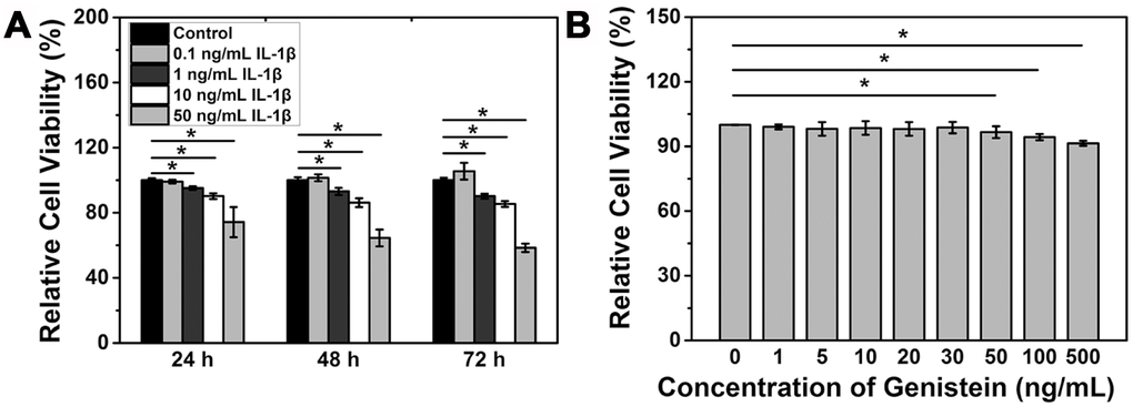NPCs were seeded in a 96-well plate at 5000 cells per well. After 24 h, the cells were treated with different concentration of IL-1β or Genistein. CCK-8 (Dojindo Molecular Technologies, Inc, Japan) assay was used for measuring cell viability following the manufacturer’s protocol. The supernatant was measured with an absorbance plate reader (Spectra Max M5, Molecular Device, CA, USA) at an OD value of 450 nm.