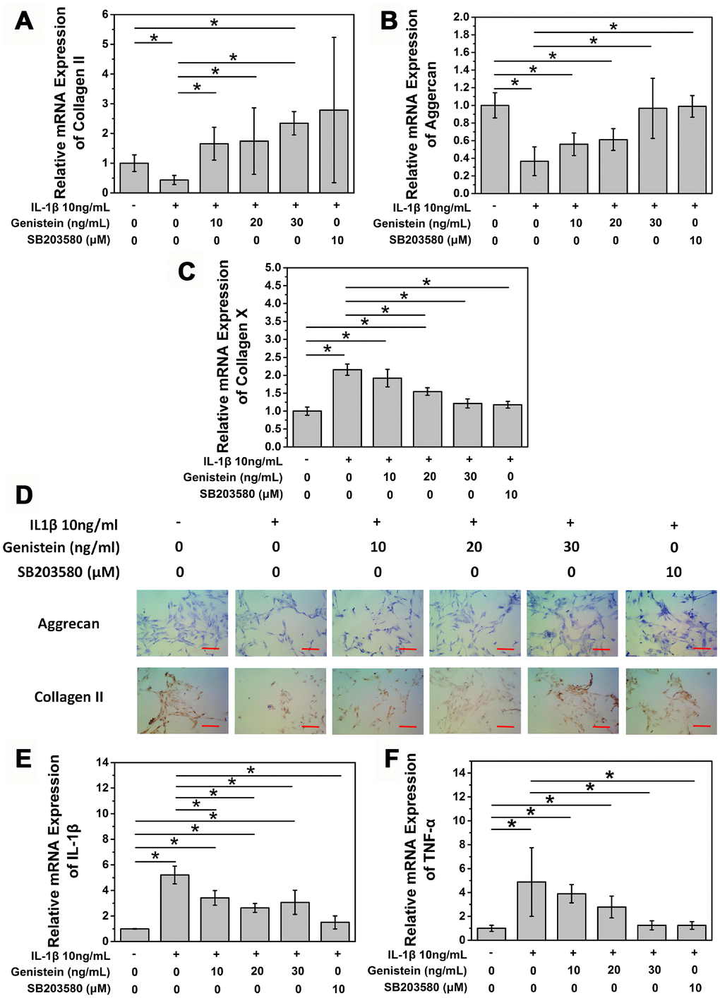Primary NPCs were treated with different concentrations of IL-1β and/or Genistein for the indicated time. Cells were then fixed with 4% PFA for 15-20 min and 3 % H2O2 was added for 10 min. Cells were blocked with goat serum (Abcam, CA, USA) for 20 min, followed by incubation with the primary antibody (anti-collagen II, Abcam) at 4 °C overnight. The next day samples were incubated with HRP-conjugated second antibody (Bioworld, CA, USA) at 37 °C for 40 min. DAB was added and the staining was observed under a microscope. Where hematoxylin was used for nuclear staining, this was followed by dehydration with 1% hydrochloric acid in ethanol, a PBS wash, then sealing and microscope examination.