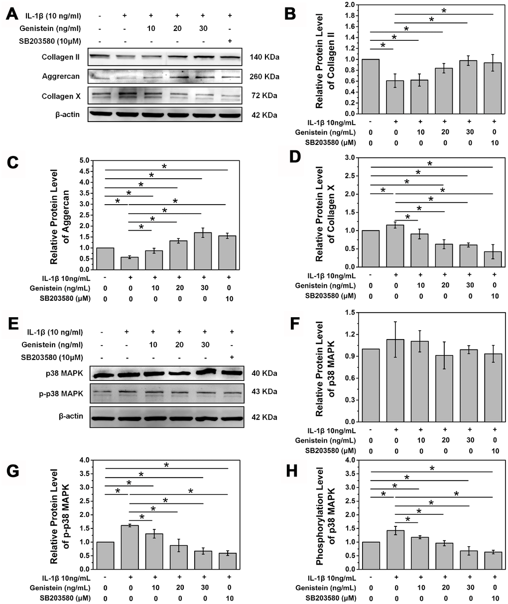 In order to further study the principle of Genistein in delaying degeneration in rat NPCs after IL-1β treatment, western blotting was performed to examine the protein levels of p38 and p-p38. Rat NPCs were seeded in a 6-well plate, grown to confluency, and then starved overnight in DMEM/F12 medium containing 1% FBS. The next day, cells were switched to serum-free DMEM/F12 culture medium containing 10 ng/mL IL-1β for 8 h and then treated with Genistein (10, 20, or 30 ng/mL) or 10 μM of SB203580. IL-1β treatment showed no effect on the protein expression of p38 MAPK (p>0.05, Figure 4E and 4F), but did significantly increase its phosphorylation (p<0.05, Figure 4E, 4G, and 4H). SB203580, a p38 MAPK pathway inhibitor, significantly inhibited the phosphorylation of p38 MAPK (p<0.05, Figure 4E, 4G, and 4H). Genistein also inhibited the phosphorylation of p38 MAPK in a dose-dependent manner (p<0.05, Figure 4E, 4G, and 4H). Treatment with a high concentration of Genistein was even able to inhibit the intrinsic phosphorylation of p38 MAPK in NPCs (p<0.05, Figure 4E, 4G, and 4H). The above results demonstrate that Genistein plays its protective role in IDD via inhibiting the phosphorylation of p38.