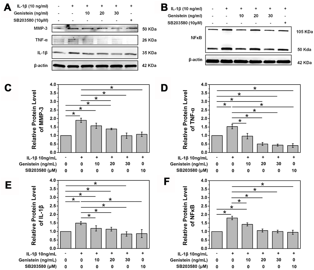 Our research further demonstrated that Genistein is able to inhibit the p38 MAPK pathway. Western blotting results showed that Genistein reduced the phosphorylation of p38 compared to the IL-1β only control group, and even enhanced the dephosphorylation of p38 compared to control, which is indicative of a substantial inhibitory effect on the p38 MAPK pathway. Both the 10 ng/mL and 20 ng/mL doses of Genistein were sufficient to effectively execute its PTK inhibitor function, leading to dephosphorylation of p-p38. This dephosphorylation effect was comparable to that of the specific inhibitor SB203580 at a concentration of 10 μM.