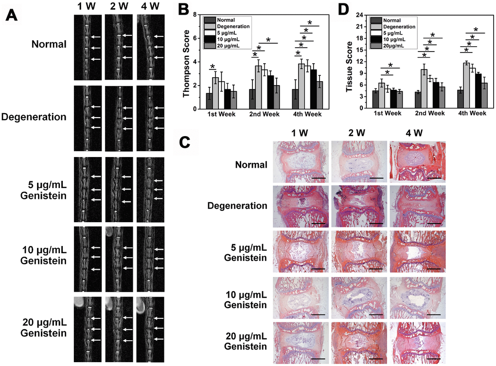 One week after treatment with 5 μg/mL Genistein, the height and volume of the intervertebral space and the number of chondroid nucleus pulposus all decreased, and the annulus fibrosus displayed varying degrees of distortion and damage. The degeneration was evident. However, the boundary between the nucleus pulposus and the annulus fibrosus remained clear. Four weeks after treatment with 5 μg/mL Genistein, the nucleus pulposus tissue was completely lost, and the annulus fibrosus damage was further aggravated. One week after treatment with 10 μg/mL or 20 μg/mL Genistein, more chondroid nucleus pulposus were observed, and with a neater arrangement compared to the 5 μg/mL Genistein group at the same time point. The annulus fibrosus displayed a regular ring structure and each layer was arranged neatly without significant degeneration. After four weeks, both the 10 μg/mL and 20 μg/mL treatment groups displayed degeneration, as evidenced by reduction in NPCs and distortion of the annulus fibrosus. However, the 20 μg/ml treatment group showed less degeneration than the 10 μg/ml treatment group (Figure 6C).