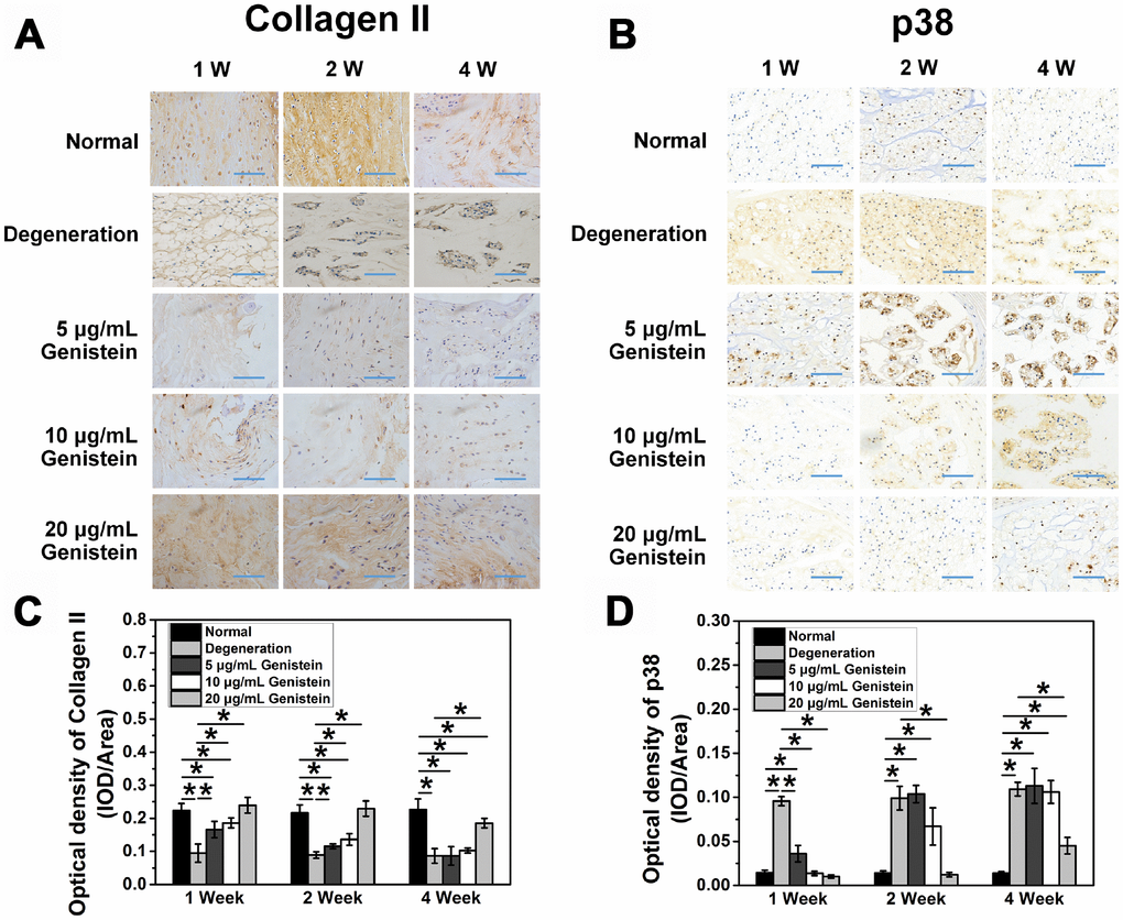 Immunohistochemical staining of type II collagen and p38 was performed to identify the expression of these two key proteins in vivo (Figure 7A and 7B). One week after treatment with 5 μg/ml Genistein, the type II collagen staining in the nucleus pulposus was light yellow, and the color gradually faded with time. Four weeks later, the staining was essentially negative. One week after treatment with 10 μg/mL and 20 μg/mL Genistein, a higher degree of yellow or brown positive staining was observed in the nucleus pulposus. Two weeks after treatment, the positive staining in the 10 μg/mL treatment group began to fade. However, the positive staining in the 20 μg/mL treatment group displayed a slight reduction in area only after four weeks. The staining gradually decreased over time in all treatment groups. The protective effect of Genistein on type II collagen levels was dose-dependent, with the 10 μg/mL and 5 μg/mL treatment groups displaying intermediate and low staining intensity, respectively (Figure 7A). Quantitative analysis of immunohisto-chemical sections also showed the significant protective effect of Genistein (p<0.05, Figure 7C).