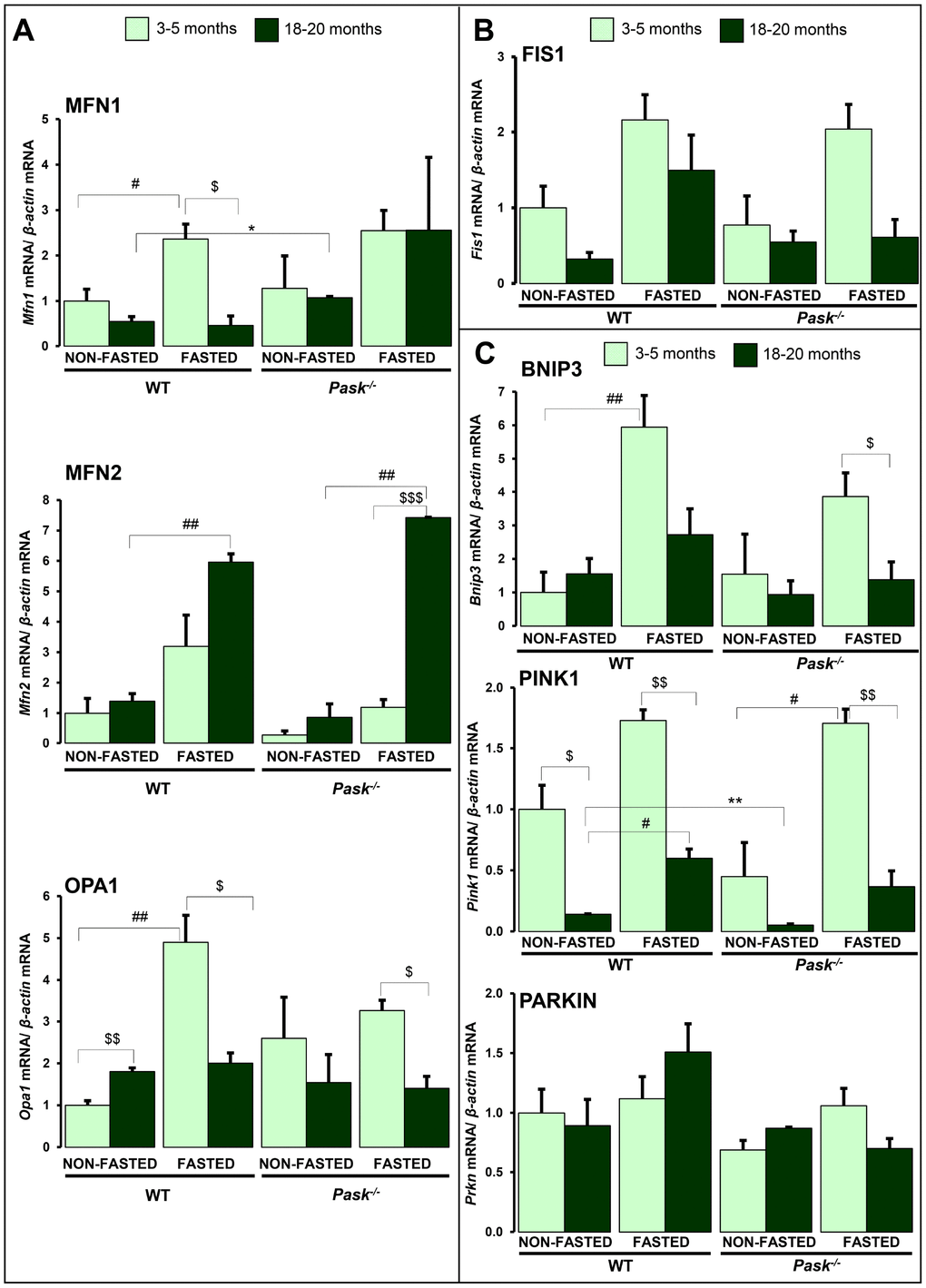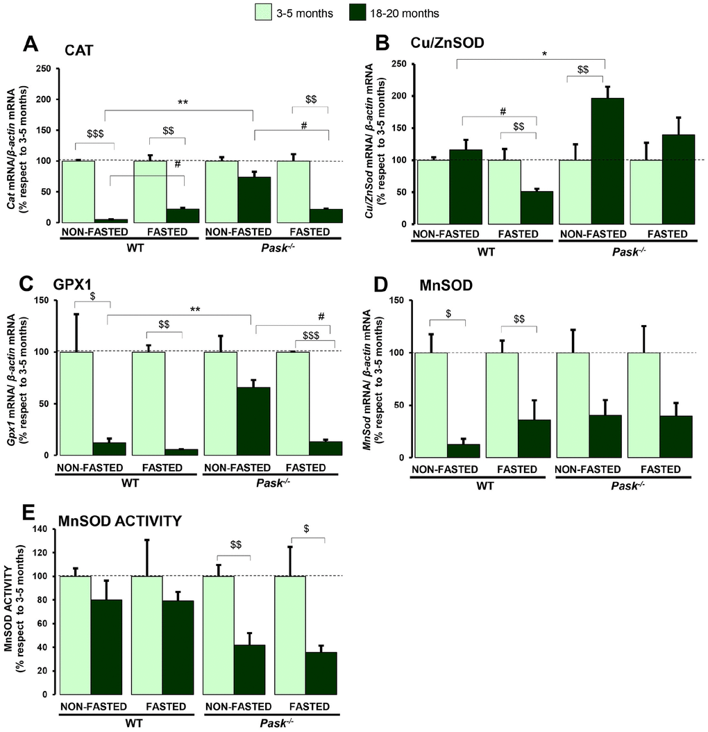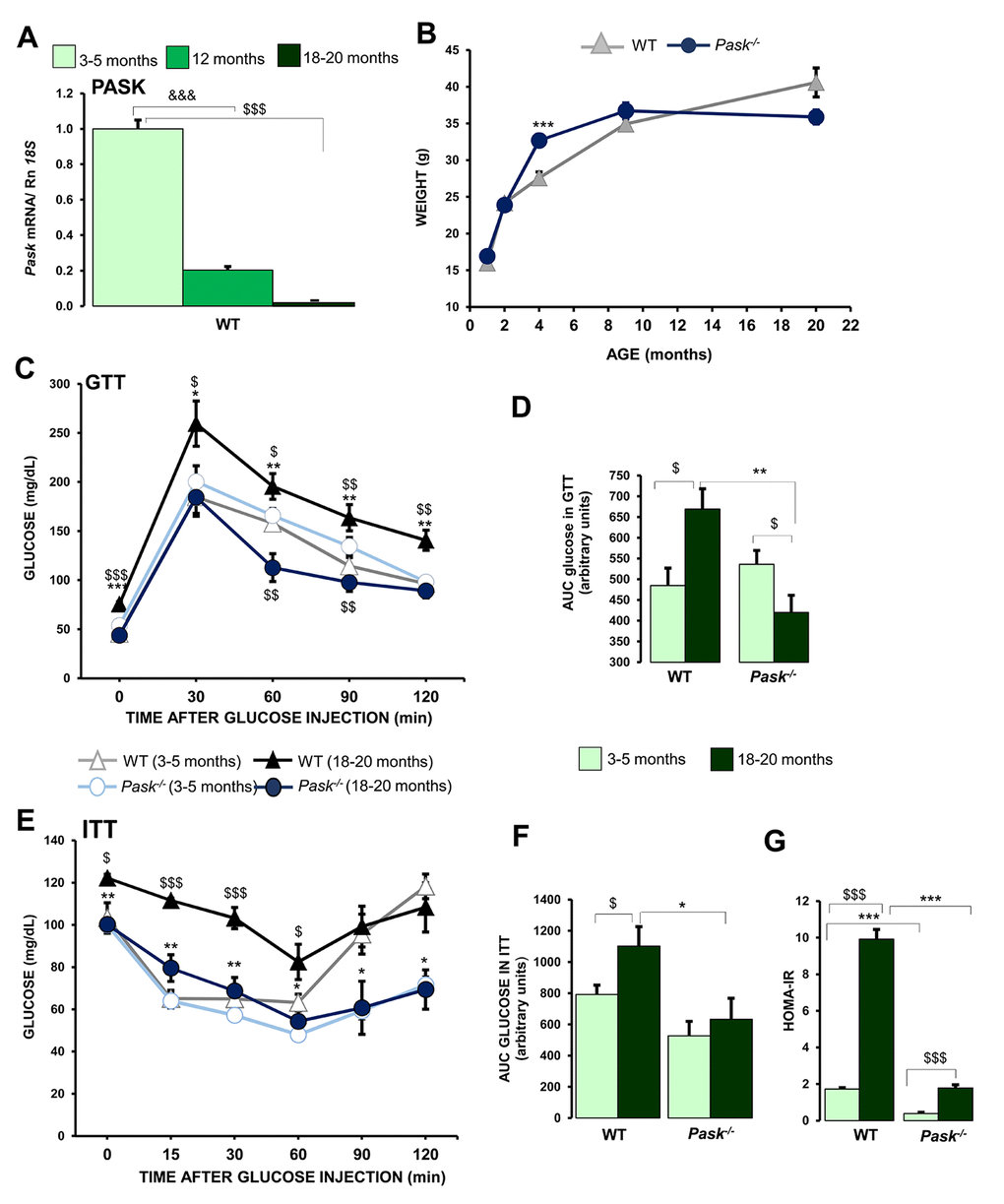 | C57BL/6J (WT) and PASK-deficient (Pask-/-) mice. **P < 0.01; ***P < 0.001 WT vs. Pask-/-; $P < 0.05; $$P < 0.01; $$$P < 0.001 3-5 months vs. 18-20 months. n=5-6. | |||||||||||||||||||||||||||||||||||||||||||||||||||||||||||||||||||||||||||||||||||||||||||||||||||