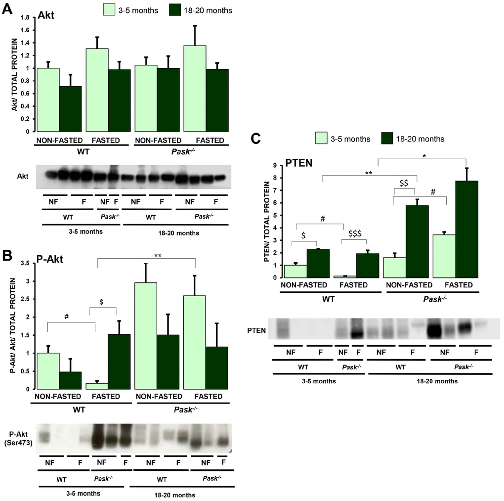It has been reported that Akt plays a key role in the aging process through the regulation of energy metabolism. Insulin signaling begins with the autophosphorylation of the tyrosine residues of the insulin receptor generating docking sites for signaling proteins. Metabolic signaling is mediated through the PI3K/Akt pathway with the activation of phosphatidylinositol-3,4,5-triphosphate kinase (PI3K). Phosphoinositide-dependent kinase-1 (PDK1) activation induces the partial activation of Akt, and full activation requires Ser473 phosphorylation by other kinases (probably mTORC2), finally regulating multiple substrates. This pathway’s signaling effect depends also on the phosphatase PTEN. We analyzed the aging effect on the expression levels and activation of Akt and PTEN in liver from non-fasted and 24-h fasted WT and PASK-deficient mice.