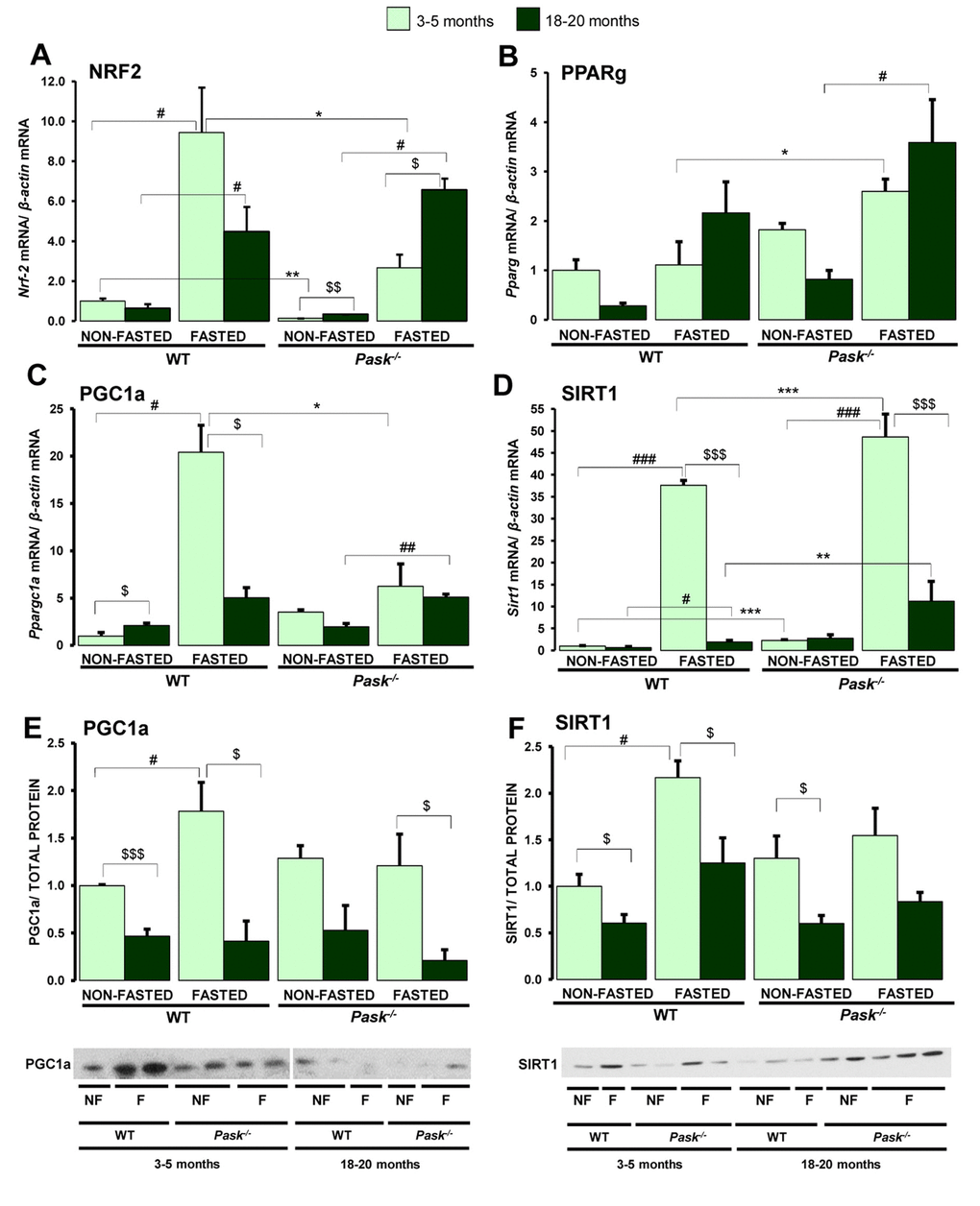 The expressions of Nrf2, Ppargc1a and Sirt1 were upregulated by fasting in young WT mice. However, aged mice were unable to induce the expression of these genes up to the levels reached in young specimens, or the induction was mild in fasting (Figure 3A, 3C, 3D). Nevertheless, the expression of these genes was higher than in the non-fasted mice. The same effect was observed in PASK-deficient mice, although the Sirt1 expression during fasting was higher than in WT mice. In the case of Nrf2, the expression was reinforced in both conditions of non-fasted and fasted aged PASK-deficient mice compared to young specimens, while the fasting effect was slightly better than in aged WT mice. In the case of Pparg (Figure 3B), aged mice showed a slight decrease in the expression under non-fasting conditions compared to young WT and PASK-deficient mice. In contrast, under fasting conditions, older mice showed a tendency to increase Pparg expression compared to young mice, which was only statistically significant in the case of PASK-deficient mice.