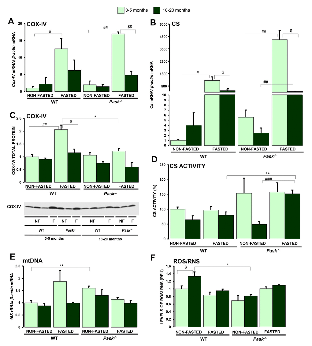 In order to evaluate the aging effect on mitochondrial biogenesis activity in liver from PASK-deficient mice, we analyzed some of the components of the machinery involved in different mitochondrial functions. PGC1a and other transcription factors and nuclear receptors regulate the expression of mitochondrial proteins, with an example being citrate synthase (CS). These mitochondrial enzymes have been tested to determine mitochondrial content and function, as well as certain genes in the electronic transport complex, such as cytochrome c oxidase subunit IV (COX-IV) and hepatic mitochondrial DNA content through the ratio of mitochondrial/nuclear DNA. Likewise, aging is characterized by an increase in oxidative stress, changes in the levels of expression of antioxidant enzymes, and mitochondrial dysfunction, seriously affecting cellular redox homeostasis. We therefore studied levels of hepatic ROS/RNS among young and aged WT and PASK-deficient mice.