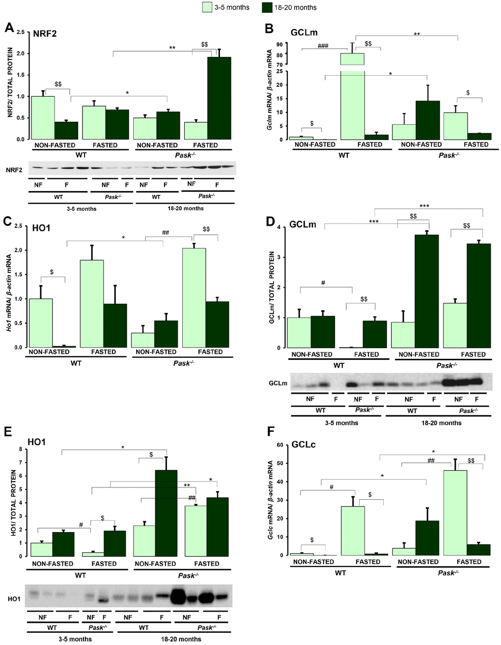 The transcription factor NRF2 functions as a major regulator of the cellular redox balance. Under high levels of ROS, it is translocated to the nucleus and induces the transcription of genes containing the Antioxidant Response Elements: Gclc/m (Glutamate-cysteine ligase catalytic/modifier subunits) and Ho1 (Heme oxygenase 1). We have therefore verified whether NRF2, GCLc/m and HO1 protein expression was altered in the liver by aging in WT and PASK-deficient mice. We have shown that the gene expression of Nrf2 increased in fasted aged PASK-deficient mice (Figure 3A). Accordingly, under fasted conditions, the NRF2 protein was also overexpressed in aged PASK-deficient mice (Figure 6A). However, aging decreased NRF2 expression under basal conditions in WT mice (Figure 6A). Similarly, either increased or similar levels of Gclc,Gclm and Ho1 were found under basal conditions in aged PASK-deficient mice, while significant decreases in these genes were detected in aged WT under both basal and fasted conditions (Figure 6B, 6C, 6F). Furthermore, decreased expressions of Gclm,Ho1 and Gclc were observed under fasted conditions in aged PASK-deficient mice, although this situation was accompanied by a higher protein level. GCLm and HO1 proteins levels were upregulated in aged PASK-deficient mice compared to aged WT under both fasting and non-fasting conditions (Figure 6D, 6E).