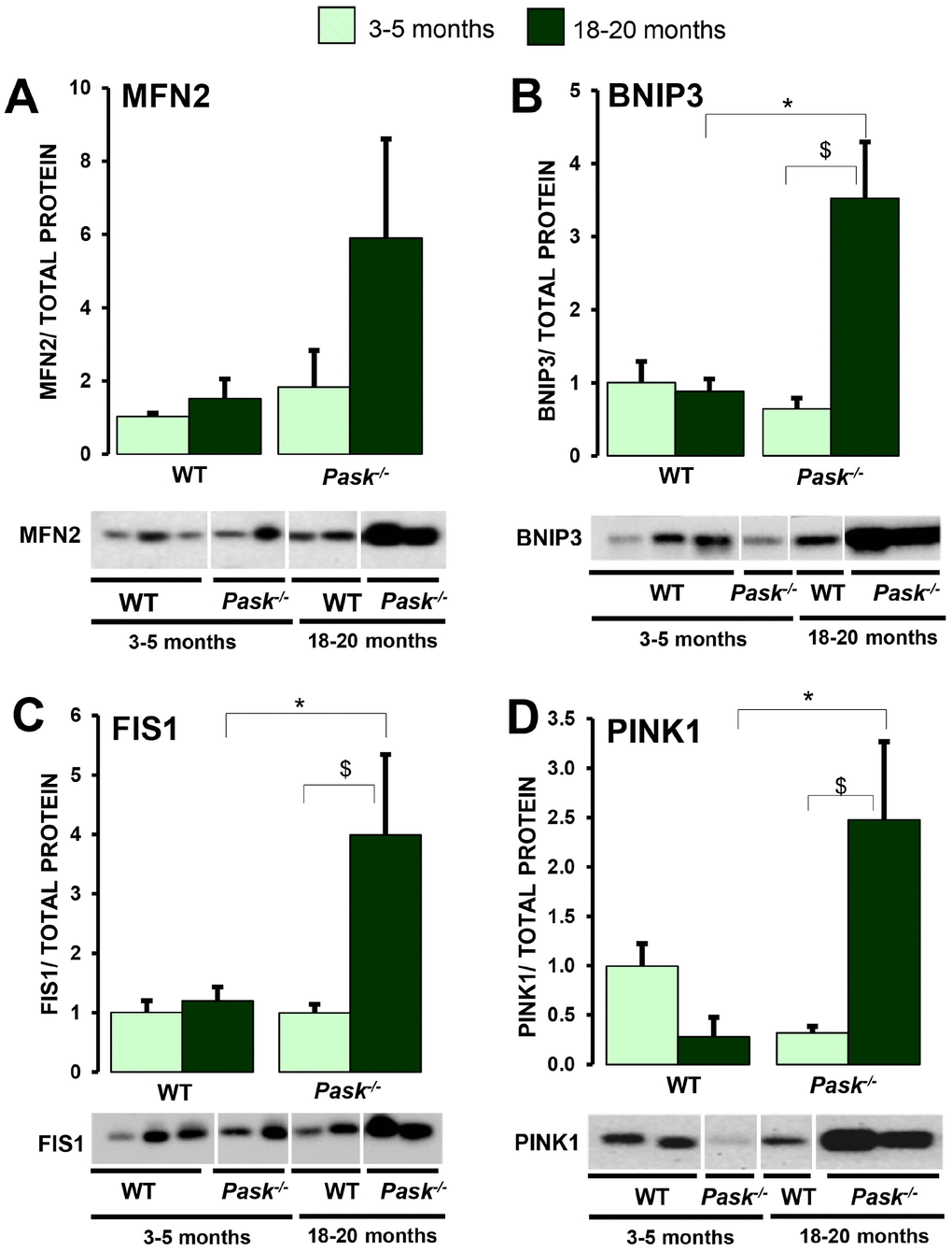 A decreased expression of Pink1, and slightly so of Mfn1 and Fis1, was observed in aged WT, while only Pink1 was lower in PASK deficiency when compared to young mice (Figure 7A–7C) under both fasted and non-fasted conditions. In addition, the stimulation of Mnf1, Opa1 and Bnip3 expression under fasted conditions disappeared in step with aging (Figure 7A, 7C) in both WT and PASK-deficient mice. However, the expression of Pink1 and Mfn2 increased in fasted aged WT and PASK-deficient mice, with the greater effect for Mfn2, whose expression was even higher than in young mice, especially in PASK-deficient specimens (Figure 7A, 7C). Nevertheless, Prkn expression was similar in young and aged mice in both genotypes (Figure 7C). In many cases, mRNA and protein levels did not correlate. Thus, decreased or similar expressions of Mfn2,Fis1, Bnip3 and Pink1 observed under basal conditions in aged PASK-deficient mice were accompanied by higher protein levels of MFN2, FIS1, BNIP3 and PINK1 compared to aged WT or young PASK-deficient mice (Figure 8A–8D).