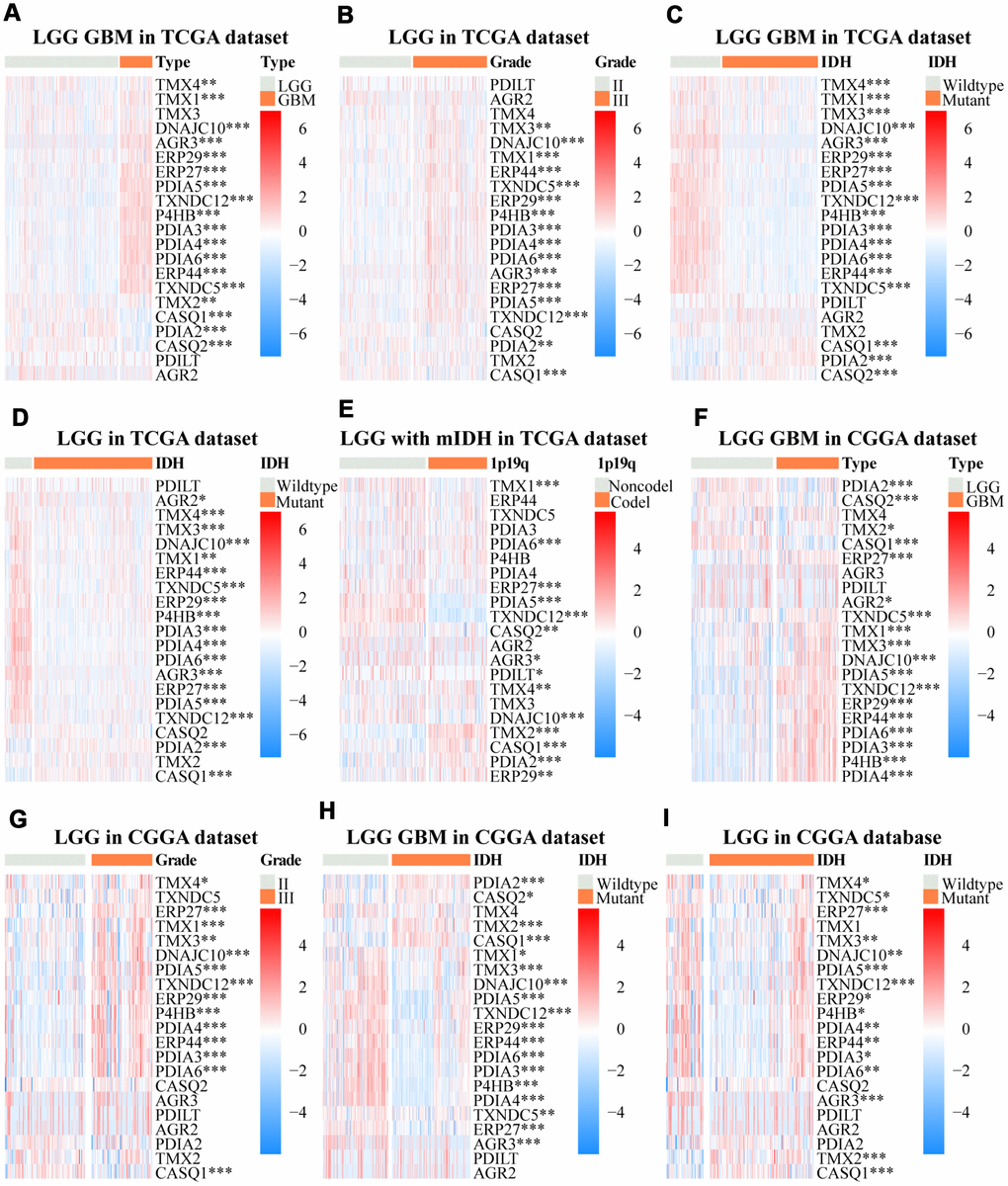 In humans, twenty-one members of the PDI family have been identified. In this study, TCGA and CGGA databases data revealed the correlation between PDIs mRNA expression and clinical-pathological features in gliomas. High transcription levels of P4HB, PDIA3, PDIA4, PDIA5, PDIA6, ERP27, ERP29, ERP44, TMX1, TMX3, TXNDC5, TXNDC12, AGR3, and DNAJC10 were found in GBM tissues. However, the transcription levels of PDIA2, AGR2, CASQ1, and CASQ2 were lower in GBM tissues than in LGG tissues (Figure 1A–1F). There was no significant difference in the mRNA level of PDILT between GBM and LGG samples based on both TCGA and CGGA (Figure 1A–1F). However, there were inconsistent findings on the mRNA expression levels of TMX2 and TMX4 from TCGA and CGGA datasets in GBM versus in LGG tissues (Figure 1A–1F). Furthermore, TCGA and CGGA datasets confirmed the significant correlation between WHO grades and mRNA levels of P4HB, PDIA3, PDIA4, PDIA5, PDIA6, ERP27, ERP29, ERP44, TMX1, TMX3, TXNDC12, DNAJC10, and CASQ1 (Figure 1B–1G). In the TCGA LGGGBM cohort, the mRNA expression of P4HB, PDIA3, PDIA4, PDIA5, PDIA6, ERP27, ERP29, ERP44, TMX1, TMX3, TMX4, TXNDC5, TXNDC12, AGR3, and DNAJC10 in gliomas with mutant IDH were lower in comparison to those in gliomas with wild-type IDH. The mRNA expression of PDIA2, CASQ1, and CASQ2 was higher in the mutant IDH group (Figure 1C). There was no significant difference in the expression levels of PDILT, TMX2, and AGR2 between the two groups. Unlike previous findings, within the CGGA LGGGBM cohort, TMX2 was up-regulated in gliomas with mutant IDH and the expression of TMX4 in the two groups was not statistically significant (Figure 1H). There was a significant difference in the expression of some members of the PDI family between the two groups (mutant IDH vs. wildtype IDH) in the LGG and GBM cohort (Figure 1D, 1I, Supplementary Figure 1A, 1B). Further, PDIA2, TMX2, and CASQ1 were down-regulated in LGG with mutant IDH and 1p19q noncodeletion, and PDIA5, PDILT, ERP27, TMX1, TXNDC12, AGR3, and DNAJC10 were up-regulated in both TCGA and CGGA (Figure 1E, Supplementary Figure 1C). There was no significant difference in the mRNA level of other members of the PDI gene family in the low-grade gliomas with mutant IDH (1p19q codeletion vs. 1p19q noncodeletion) in TCGA or CGGA (Figure 1E, Supplementary Figure 1C).