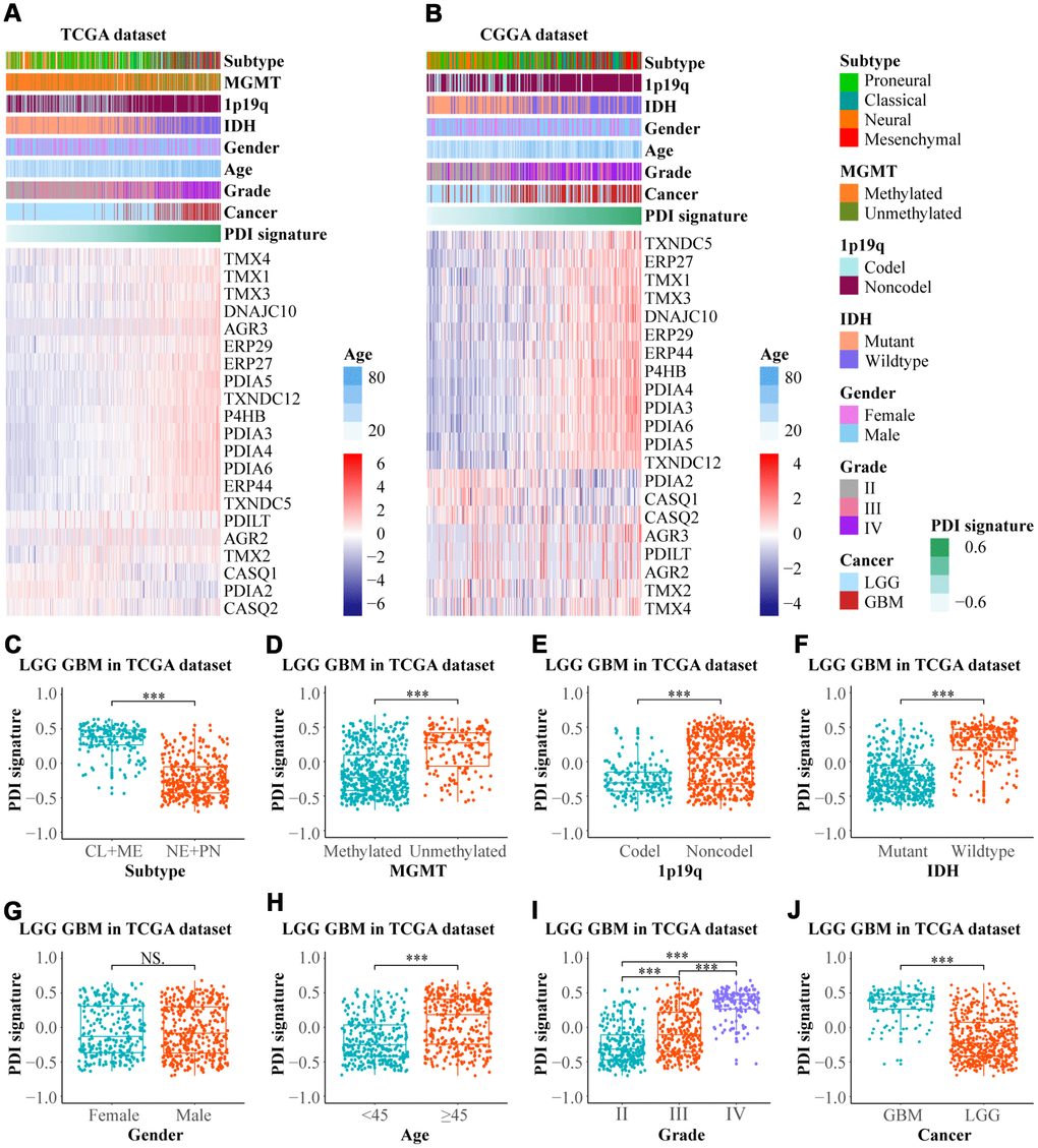 To construct a PDIs-based signature model for both in training and validation groups GSVA was performed. Heat maps presented the expression profiles of PDI family members ranked according to their PDI signatures from the TCGA and CGGA datasets (Figure 2A, 2B). In the TCGA database, gliomas were classified into four molecular subtypes; proneural (PN), neural (NE), classical (CL), and mesenchymal (ME). In the current study, gliomas were further classified into two main subtypes based on their malignancy (CL+ME vs. NE+PN). The value of PDI signature in patients separated by subtype, MGMT promoter status, 1p19q codel status, IDH status, gender, age, grade, and cancer (LGG vs. GBM). In the TCGA LGGGBM cohort there were significant differences between the patients separated by subtype (CL+ME vs. NE+PN), MGMT promoter status, 1p19q codel status, IDH status, age, grade, cancer (LGG vs. GBM), but not by gender (Figure 2C–2J). Supplementary Figure 1D showed that there was no significant difference in PDI signature between classical and mesenchymal subtypes. Further, there were statistical differences observed in the groups divided by subtype (CL+ME vs. NE+PN), 1p19q codel status, IDH status in TCGA LGG and/or GBM cohort. However, there was no significant difference in the MGMT promoter status and IDH status in the TCGA GBM cohort (Supplementary Figure 1E–1J).