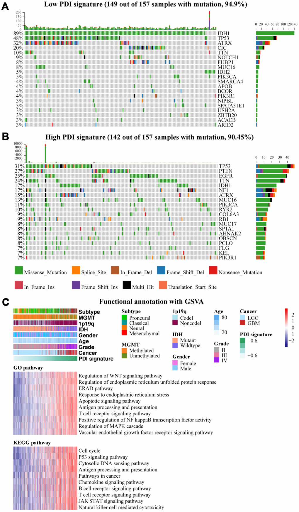 The prognostic differences between low and high-risk groups divided by the median risk score were compared. As shown in Supplementary Figure 4A–4I, the patients with high-risk score had significantly shorter OS, PFI, and DSS than those with a low-risk score in the TCGA LGGGBM, LGG, GBM cohorts. Similarly, the high-risk score was correlated with poor OS in the CGGA datasets (Supplementary Figure 4J–4L). In summary, these findings imply that the PDIs-based model plays an important role in the prediction of patients’ clinicopathological characters and prognosis. Somatic mutations were observed in 149 (94.9%) and 139 (88.54%) of 157 samples in the groups with a low and high-risk score respectively. There were some genes shown mutations in the two groups (low vs. high- risk score): IDH1, TP53, ATRX, TTN, PIK3CA, and MUC16. The frequency of IDH1, TP53, and ATRX mutations was significantly higher in gliomas with low risk score than those with high risk score (IDH1, 87% vs. 8%; TP53, 38% vs. 30%; ATRX, 24% vs. 10%), while the mutation frequency of TTN, PIK3CA, and MUC16 was significantly lower (TTN, 8% vs. 24%; PIK3CA, 6% vs. 11%; MUC16, 3% vs. 15%). Mutations of CIC (28%), FUBP1 (16%), and NOTCH1(12%) in low risk score group and, EGFR (30%), PTEN (25%), NF1 (13%), RYR2 (12%), and RB1 (11%) in high risk score group were identified (Figure 7A, 7B).