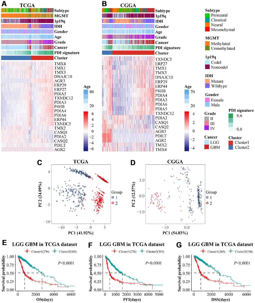 Tumor samples from TCGA and CGGA datasets were grouped into two clusters (cluster 1, cluster 2) using consensus clustering analysis to explore PDIs’ potential predictive and prognostic value. Cumulative distribution function (CDF) curves and consensus matrixes (Supplementary Figure 3A–3D) determined the optimal number of clusters (k=2). As shown in Figure 4A–4B, cluster 1 was related to the status of MGMT promoter unmethylated, 1p19q noncodel, IDH wildtype, higher grade, and GBM. Glioma patients in cluster 1 also had a higher PDI signature compared with cluster 2. The principal component analysis demonstrated the difference of PDIs mRNA expression between the two clusters (Figure 4C–4D).