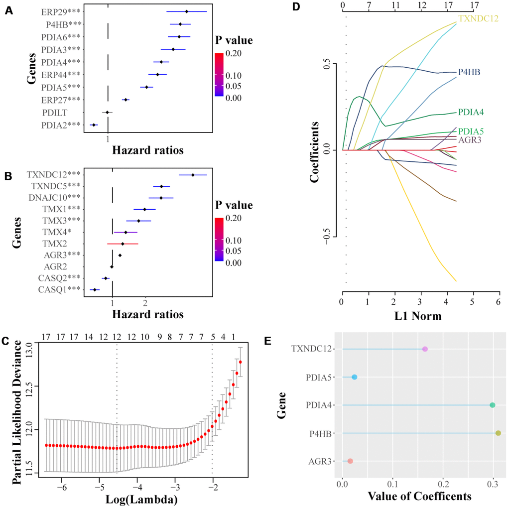 The LASSO Cox regression was used to construct a PDIs-based survival risk assessment model. Prognostic PDI family members were used to calculate the LASSO coefficients, according to the highest lambda value through Lasso method (lambda 1se) with 10-fold cross validation [48]. Subsequently, the risk score model of glioma was established based on LASSO coefficients. The association between risk score and PDIs expression and clinical characters was illustrated by heat maps and box plots.