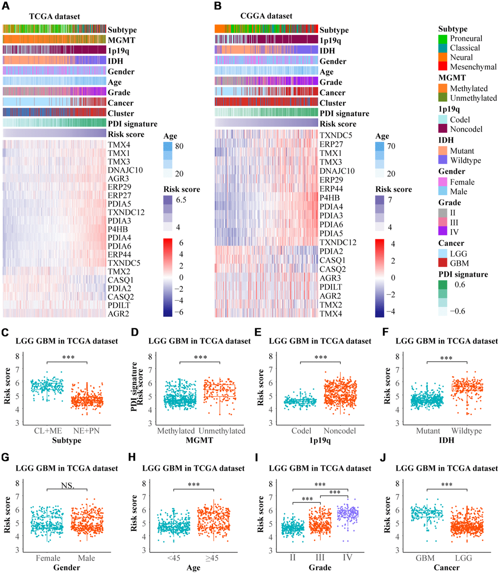 A total of 18 significant factors with p < 0.05 were selected through the univariate COX regression analysis (P4HB, PDIA2, PDIA3, PDIA4, PDIA5, PDIA6, ERP27, ERP29, ERP44, TMX1, TMX3, TMX4, TXNDC5, TXNDC12, AGR3, DNAJC10, CASQ1, CASQ2) (Figure 5A–5B). These were then introduced into the LASSO Cox regression model, which exhibited the five most meaningful PDI family members and their coefficients which was used to calculate the risk score (Figure 5C–5E). The heat maps displayed the expression profiles of PDIs both in TCGA and CGGA datasets, as the samples were ranked according to their risk scores (Figure 6A, 6B). In the TCGA LGGGBM dataset, the risk score in different groups was stratified by clinical features, and exhibited by box plots. The higher risk score was related to the subtype (CL+ME vs. NE+PN), MGMT promoter unmethylated, 1p19q noncodel, IDH wildtype, age≥45, and GBM groups (Figure 6C–6F, 6H, 6J, 6E). As shown in Supplementary Figure 3E, there was no significant difference in the risk score between classical and mesenchymal subtypes. Moreover, the risk score increased along with the WHO grade of gliomas (Figure 6I). However, there was no significant difference in groups separated by gender (Figure 6G). There were statistical differences in the LGG/GBM patients classified by subtype (CL+ME vs. NE+PN), 1p19q codel status, IDH status, but not by MGMT promoter status in the TCGA GBM cohort (Supplementary Figure 3F–3K).