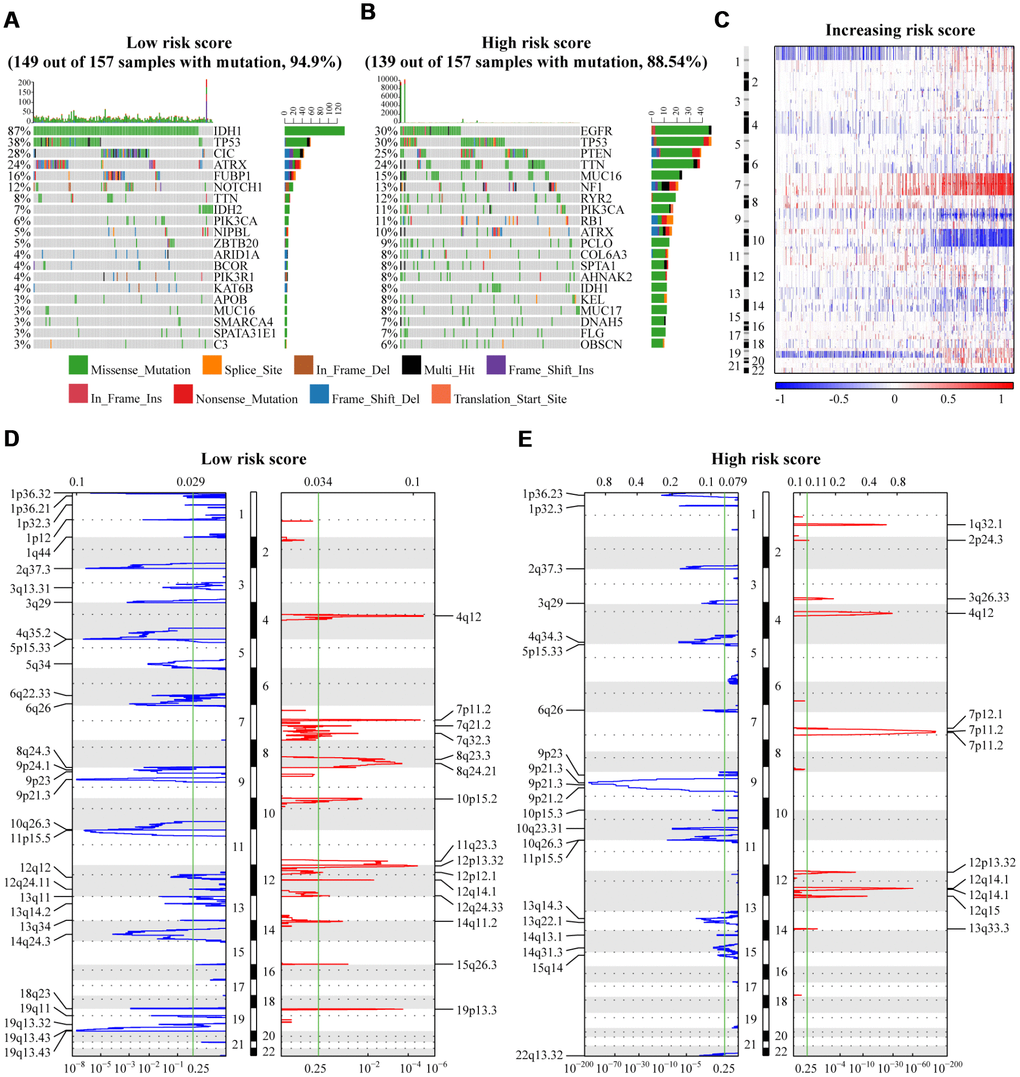SCNAs between samples with low and high-risk scores was investigated considering the somatic copy number alternations’ roles in oncogenesis. The incidence of the amplification of Chr 7 together with a deletion of Chr 10 increased with an increase in the value of risk score in gliomas, while the codeletion of 1p/19q decreased (Figure 7C). GISTIC 2.0 analysis identified several significant regions of amplification harboring multiple oncogenes in gliomas with a high-risk score, including 1q32.1 (PIK3C2B), 4q12 (PDGFRA), 7p11·2 (EGFR), and 12q14·1(CDK4). Focal deletion peaks were detected in the group with a high-risk score, such as 9p21·2 (TUSC1), 9p21·3 (CDKN2A, CDKN2B), 10q23·31 (PTEN, FAS), and 10q26·3 (BNIP3). Although the focal amplification and deletion peaks were also present in the low risk score cases, their G values were significantly lower (Figure 7D–7E). Additionally, there were significant genomic regions of amplification (8q23·3, 8q24·21, 11q23·3, 19q13·3) and deletion (1p12, 4q35·2, 14q24·3, 18q23, 19q13·43) observed only in gliomas with low-risk scores (Figure 7E).