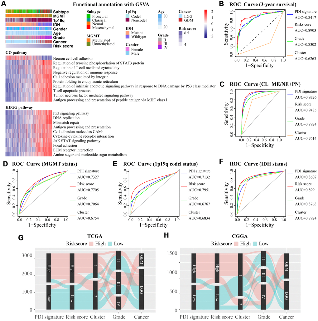 ROC analysis compared the PDI signature, risk score, cluster and grade in predicting prognosis and clinical characters. The risk score was the best indicator in predicting 3-year survival, subtype (CL+ME/NE+PN), MGMT status, 1p19q codel status and IDH status. Consensus clustering analysis model was the least performer in predicting prognosis and clinical features (Figure 8B–8F). The Sankey diagrams indicated that glioma patients with high-risk scores had higher PDI signature, higher grade and mainly enriched in cluster1, while the low-risk score was associated with low PDI signature, lower grade and cluster2 (Figure 8G–8H). Besides, there was a positive correlation between risk score and PDI signature (r = 0·84, p < 0.001) (Supplementary Figure 5A).