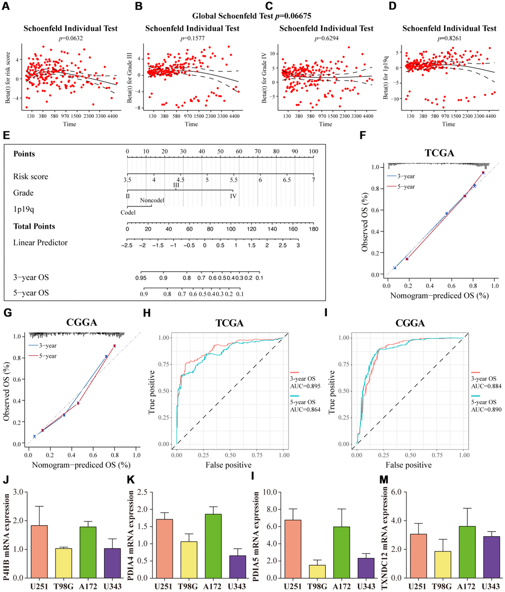 The qRT-PCR assay was performed to identify significant genes for construction of the risk score model in gliomas. AGR3 was eliminated as it played a non-significant role in this model. As shown in Figure 9J–9M, all four genes, P4HB, PDIA4, PDIA5, and TXNDC12, were expressed in glioma cell lines, and these genes were differentially expressed in different cell lines (U251, T98G, A172, U343).
