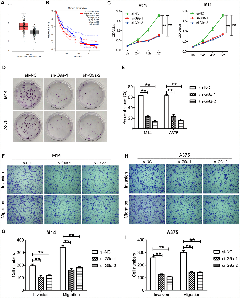 Dysfunction of cell proliferation, migration and apoptosis are crucial events that may promote cancer development. Therefore, analysis of the role of the target gene on typical cellular behavior of cancer cells is important for studying certain gene functions. So, we sought to elucidate the cellular behaviors of melanoma cells under the control of G9a. First, CCK assay was utilized to detect the effect of G9a on the proliferation of M14 cells. As shown in Figure 1C, the results indicate a remarkable decrease in the rate of cell proliferation of si-G9a groups (si-G9a-1 and siG9a-2) compared to the si-NC group, suggesting an effective role of G9a on cell proliferation. We further used clone formation assay to investigate cell proliferation of M14 and A375 cells. To get a prolonged knockdown effect, we constructed the stable knockdown cell lines using lenti-virus carrying sh-G9a-1 and 2 sequences. As shown in Figure 1D, the number of clones in both of the sh-G9a group decreased to approximately 40% of that of the siNC group in both cell lines (Figure 1D, 1E). All of the results indicated that G9a played a crucial role in maintaining melanoma proliferation. We further examined the migration and invasion ability of the cells upon both of si-G9a transfection by transwell. As shown, there was a significant decrease in the migration and invasion ability of siG9a group cells compared with si-NC group cells (Figure 1F–1I). These results suggest that G9a promotes the migration and invasion of melanoma cell lines.
