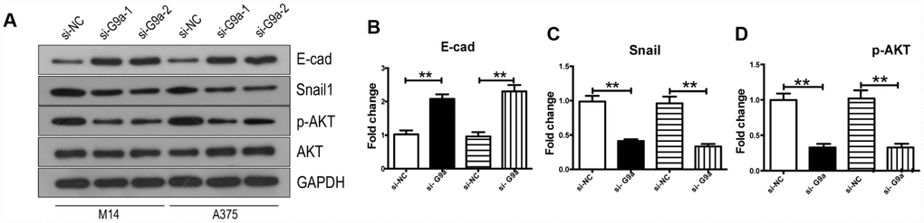 The aberrant upregulation of G9a in melanoma suggests it is a good candidate as a potential therapeutic molecular target. We transfected G9a siRNA into M14 and A375 cells and investigated the change of biological phenomenon. The results showed that silencing of G9a reduced cell proliferation, migration, and invasion in human melanoma cells, and also induced apoptosis. In addition, the results showed that si-G9a caused downregulation of BCL-2 and significant upregulation of cleaved-Caspase 3, which are both involved in apoptosis. Studies have shown that p-AKT activates or inhibits its downstream target proteins Caspase3, P70 and NFκB through phosphorylation, thereby regulating cell proliferation, apoptosis and migration. In this study, G9a regulated the expression of Caspase3 and P70 by activating AKT pathway, and then regulated the proliferation and apoptosis of melanoma cells.