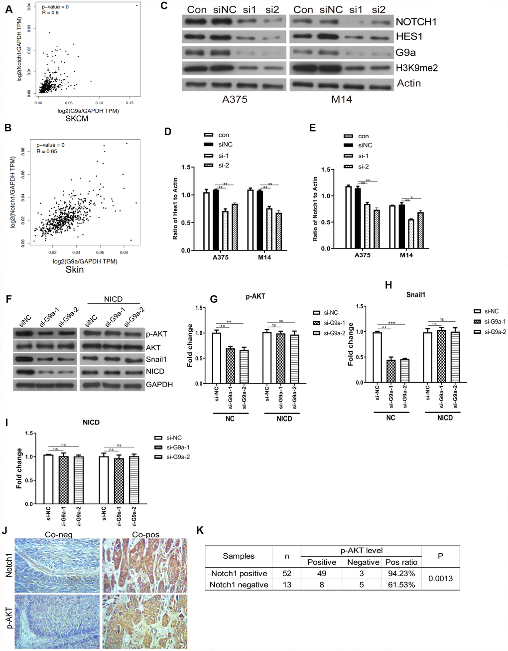 Notch signaling is a critical process for the malignancy of melanoma cells [40, 41]. In this study, we further investigated the role of G9a on Notch1 expression and activity in melanoma cells. We analyzed the relationships between different genes via GEPIA. As shown in Figure 3A and 3B, there was a moderate positive correlation between G9a and Notch1 (R=0.6, p<0.01; Pearson correlation analysis). Results from data analysis suggested potential interactions between G9a and Notch1 during melanoma development. This provided us with a direction for further research. We utilized Western blot analysis to detect whether G9a is involved in Notch1 activity in melanoma cell lines M14 and A375. As shown in Figure 3C–3F, along with the important substrate H3K9me2, the protein levels of Notch1 and Hes1 were also decreased in siG9a groups. To further address whether the role of G9a on PI3K-AKT signaling is dependent on Notch activity, we detected the phosphor-AKT and Snail1 by WB after ectopic expression of NICD (the active form of Notch1) and G9a knockdown. As shown in Figure 3G–3J, ectopic expression of NICD blocked the response for si-G9a. Further, the protein level of Notch 1 and p-AKT in melanoma samples was detected by IHC. As shown in Figure 3K and 3L. the p-AKT positive rate in Notch1-positive tissue was 94.23%, much higher than the rate in Notch1-negative tissue (61.53%). According to the above results, we can conclude that G9a activated the Notch1 pathway, and then, Notch1 signaling pathway further modulates the activity of PI3K-AKT.