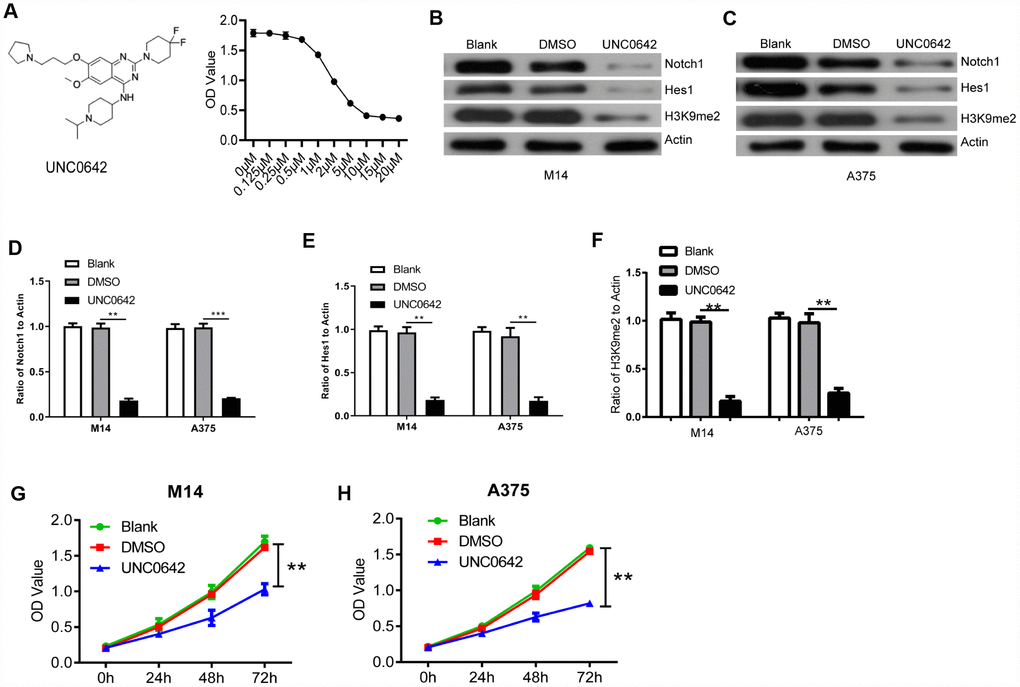 UNC0642 is a newly discovered inhibitor of G9a, which demonstrates high cellular potency and excellent selectivity in numerous cell lines [18] For instance, we used it for further targeting of G9a of melanoma cells both in vitro and in vivo. In order to identify whether UNC0642 affects the cellular functions of melanoma cells, different concentrations of UNC0642 were used to treat melanoma cell lines A375 and detected by CCK8 assay. Our results showed that UNC0642 had no effect on survival of A375 cells at the concentration lower than 0.5nM. At the concentration of 2 μM or higher, UNC0642 had a significant inhibitory effect on the viability of A375 cells in a dose-dependent manner (Figure 4A). The IC50 of UNC0642 was 3.062 μM for A375 cells, and 2 μM of UNC0642 was used to treat M14 and A375 cells for the rest experiments (Figure 4A). Further we detected the role of UNC0642 on the activity of Notch1 signaling by WB. As shown in Figure 4B–4F, the protein levels of Notch1, Hes1 and H3K9me2 decreased in UNC0642 groups. Further we performed CCK8 assay to investigate the effect of G9a on the proliferation of melanoma cells. Results from the CCK8 assay revealed that UNC0642 treatment significantly reduced the proliferation of M14 and A375 cells (Figure 4G–4H).