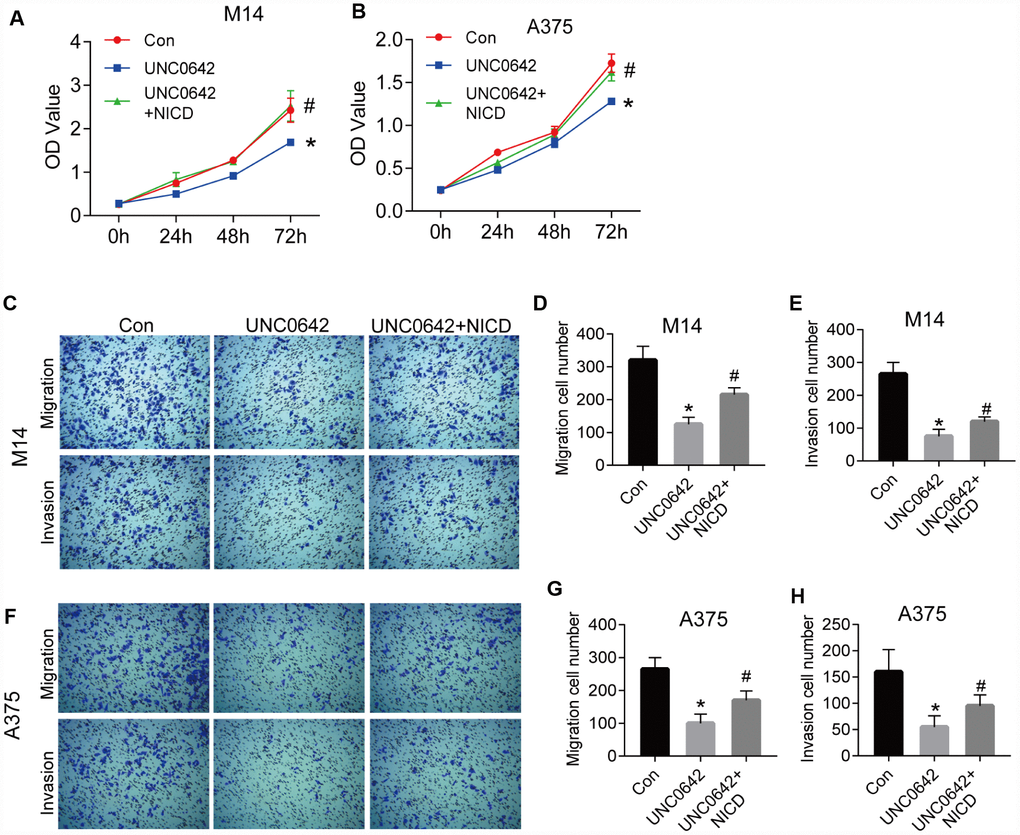 To explore whether G9a modulates cell viability via the Notch1 pathway in melanoma cells, the CCK-8 assay was utilized to evaluate the viability of M14 and A375 cell lines with UNC0642. Results from the CCK8 assay revealed that UNC0642 treatment significantly reduced the proliferation of M14 and A375 cells, but cell viability was restored after ectopic expression of NICD, the active form of Notch1 (Figure 5A, 5B). We next evaluated the effect of UNC0642 on cell migration and invasion via transwell assay. The transwell assay analysis showed that UNC0642 treatment resulted in significantly reduced migration and invasion of M14 and A375 cells, whereas both migration and invasion in M14 and A375 cells were restored to some extent after overexpression of NICD (Figure 5C–5H). In sum, these data indicate that G9a can regulate melanoma cell viability, migration and invasion via the Notch1 signaling pathway.