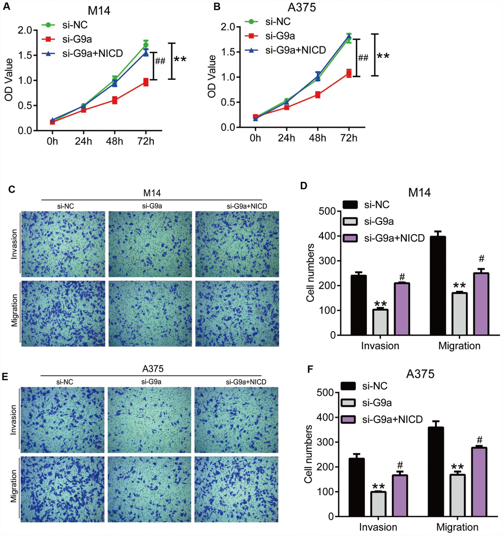 To exclude the potential off-target of UNC0642, we confirmed the above experiments with G9a knocking down by siRNA (Figure 6). As shown in Figure 6A and 6B, the CCK8 assay revealed that siG9a treatment significantly reduced the proliferation of M14 and A375 cells, but cell viability was restored after ectopic expression of NICD. The transwell assay analysis showed that siG9a transfection resulted in significantly reduced migration and invasion of M14 and A375 cells, whereas both migration and invasion in M14 and A375 cells were restored to some extent after overexpression of NICD (Figure 6C–6F).